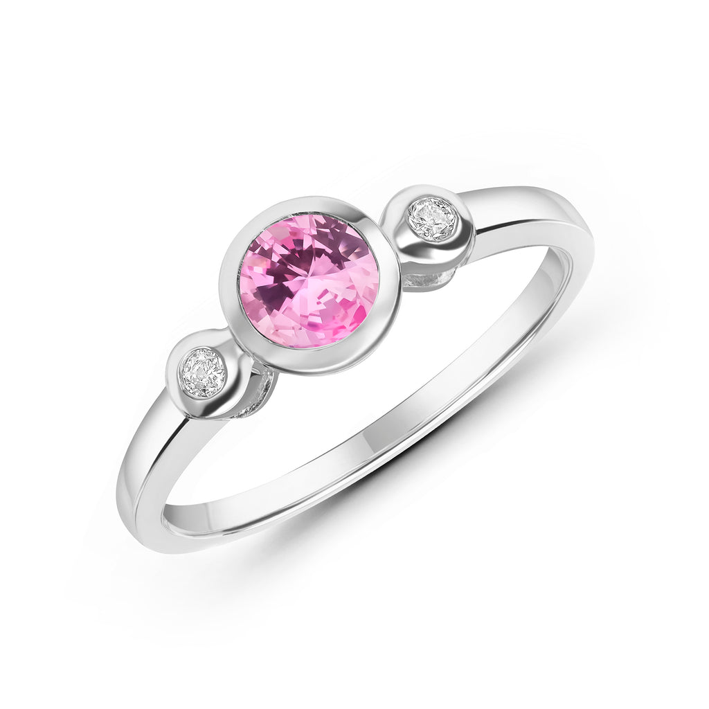 9CT White Gold Oval Pink Tourmaline & Round Diamond Three Stone Rubover Ring