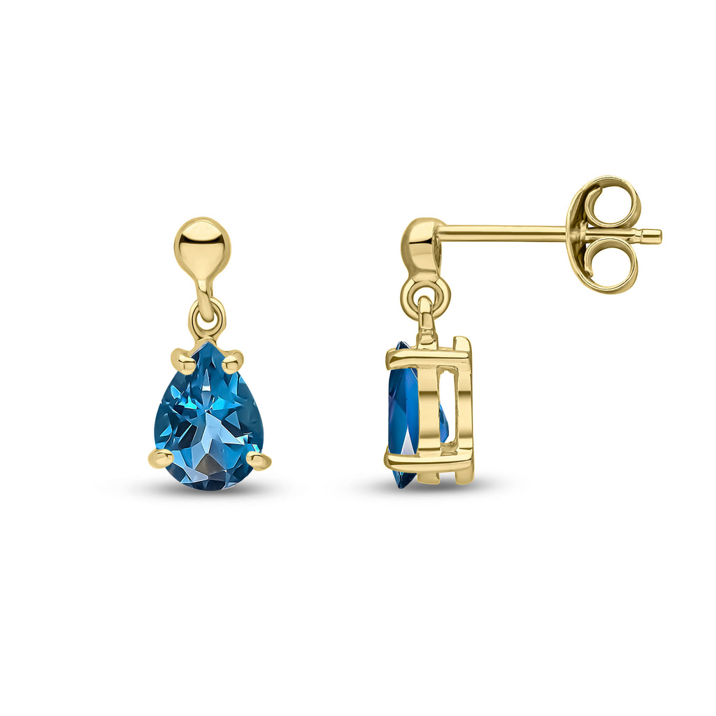 9CT Yellow Gold Pear Shaped London Blue Topaz Drop Earrings 7x5mm