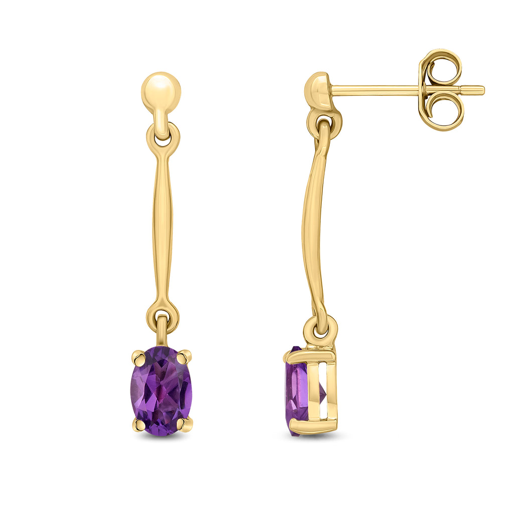 9CT Yellow Gold Oval Amethyst Bar Drop Earrings 6x4mm