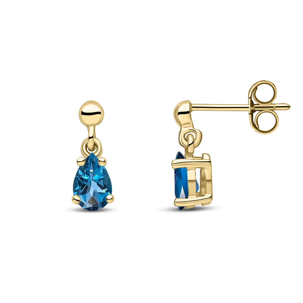 9CT Yellow Gold Pear Shaped London Blue Topaz Claw Drop Earrings 6x4mm