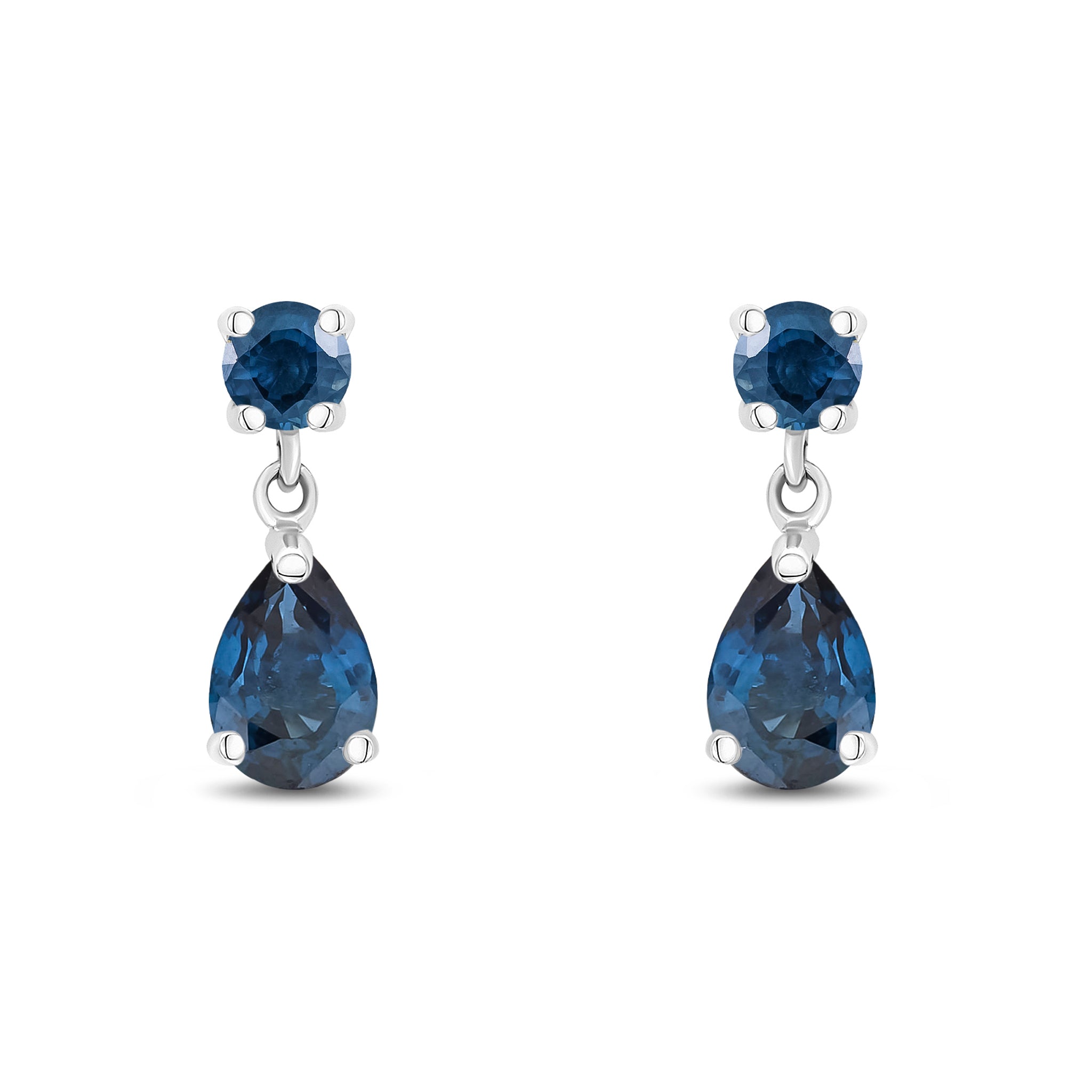 9CT White Gold Round & Pear Shaped Sapphire Two Stone Drop Earrings