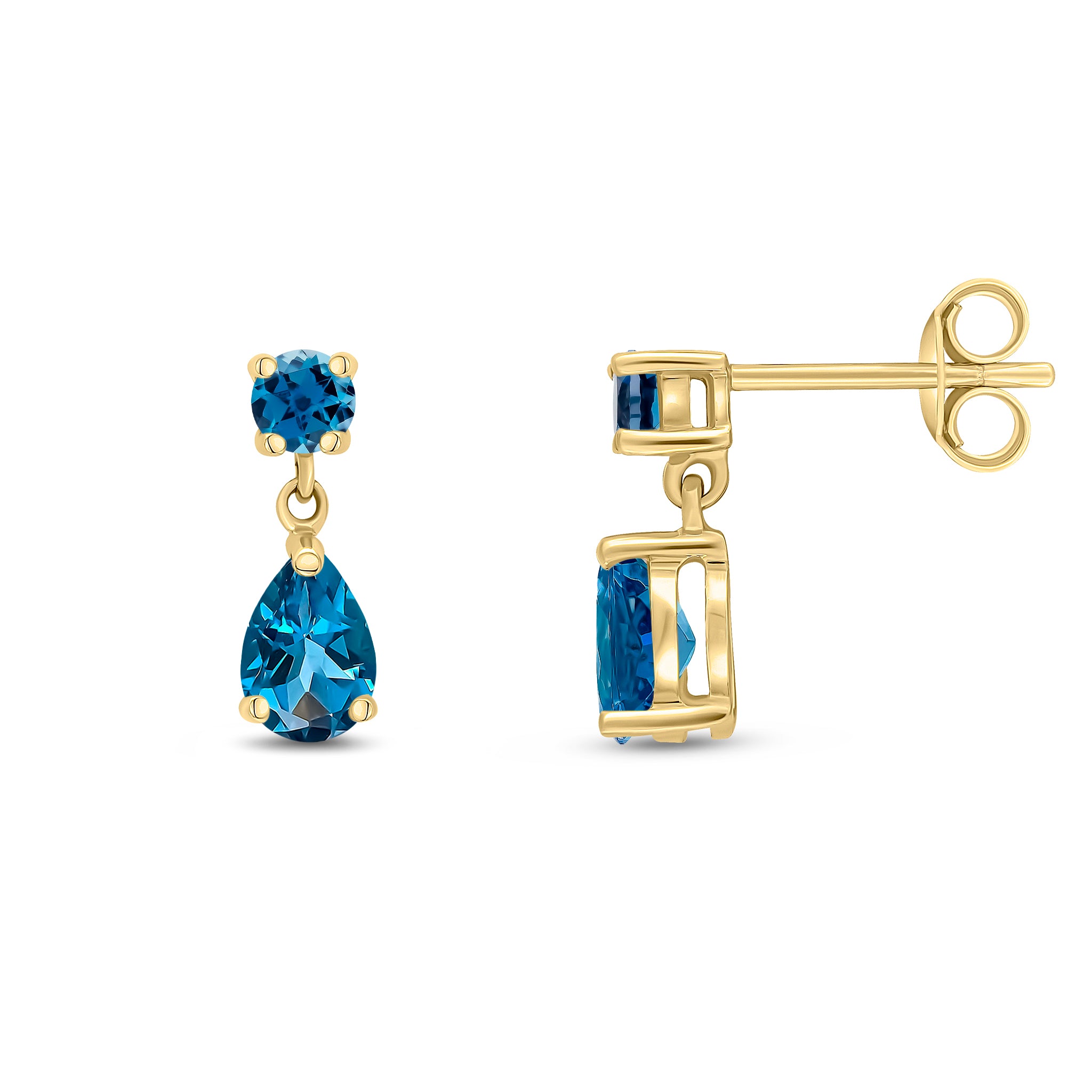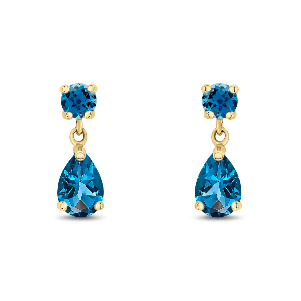 9CT Yellow Gold Round & Pear Shaped London Blue Topaz Two Stone Drop Earrings