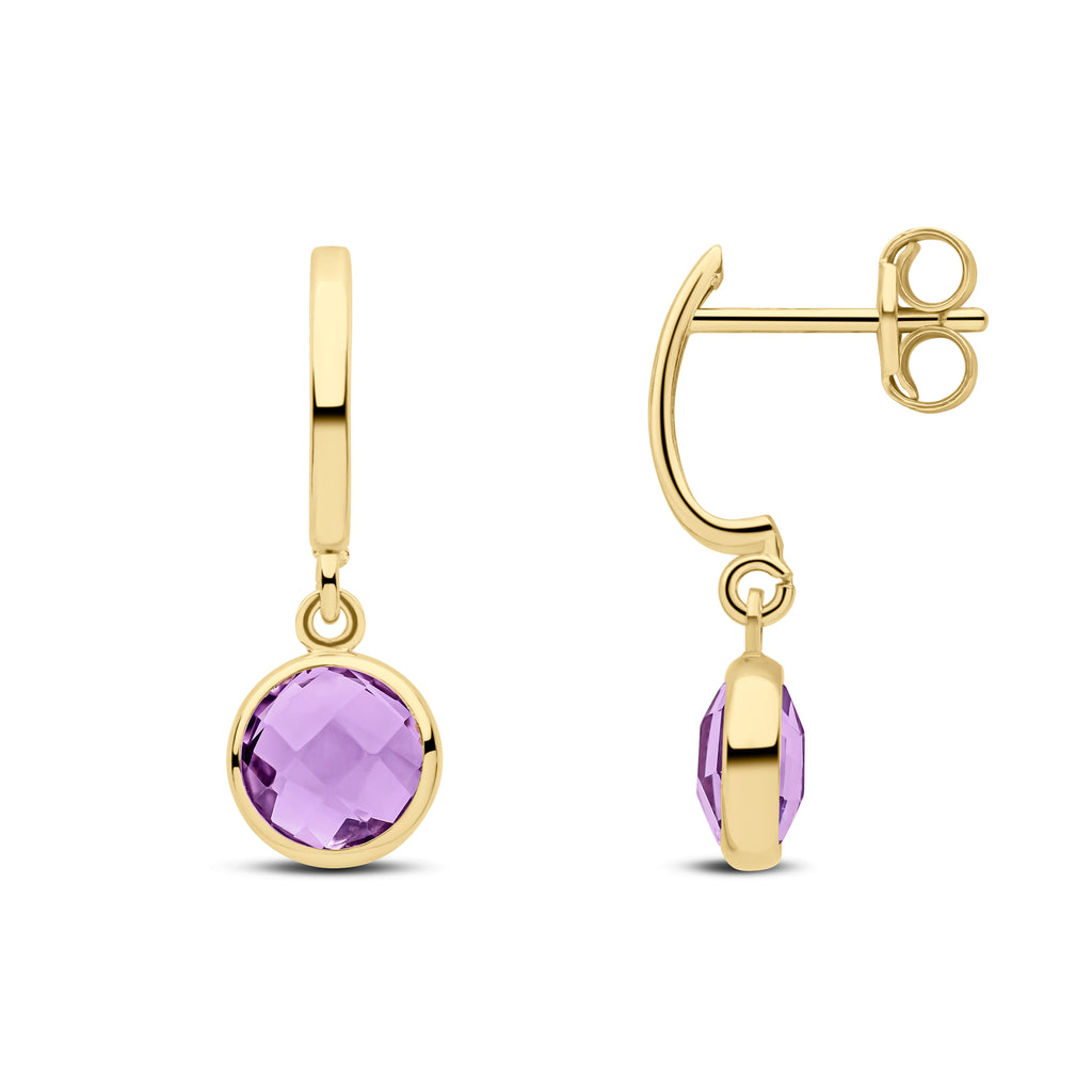 9CT Yellow Gold Curved Bar with Checkerboard Cut Round Amethyst Spec Set Drop Earrings