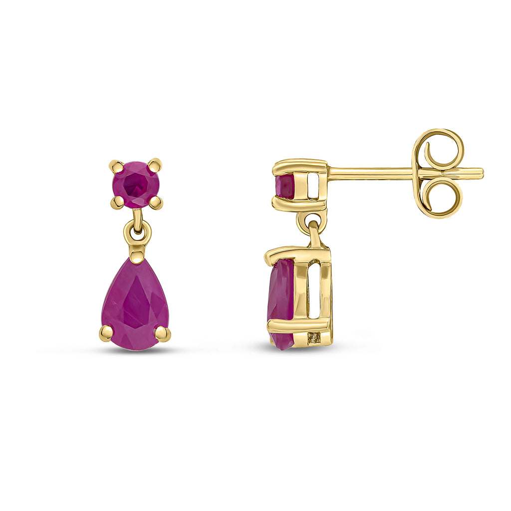 9CT Yellow Gold Round & Pear Shaped Ruby Two Stone Drop Earrings