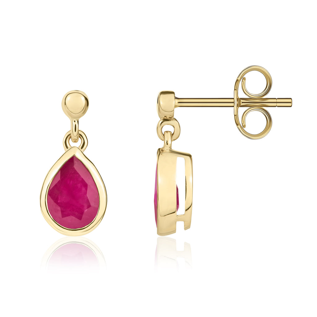 9CT Yellow Gold Pear Shaped Ruby Double Stone Rubover Drop Earrings