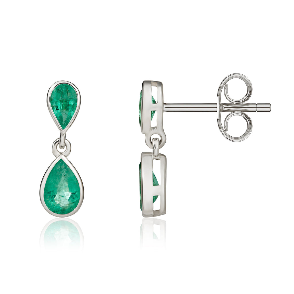 9CT White Gold Pear Shaped Emerald Double Stone Rubover Drop Earrings