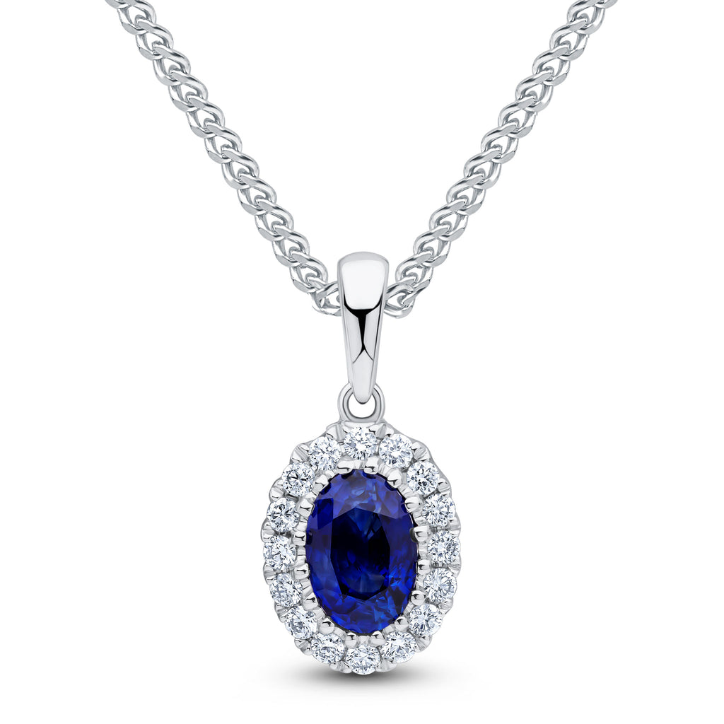 18CT White Gold Oval Sapphire & Diamond Cluster Pendant 7x5mm