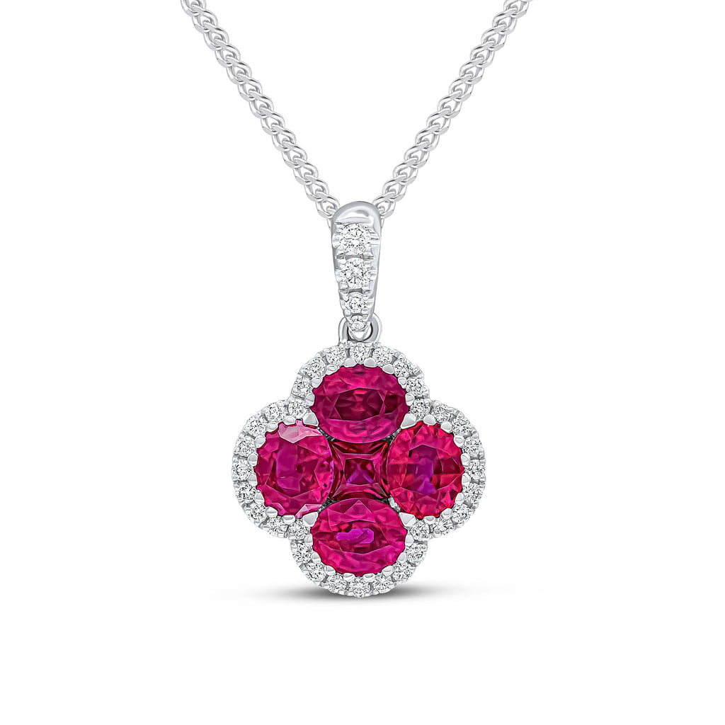 18CT White Gold Round & Square Ruby & Diamond Quatrefoil Cluster Pendant with Diamond Loop Top