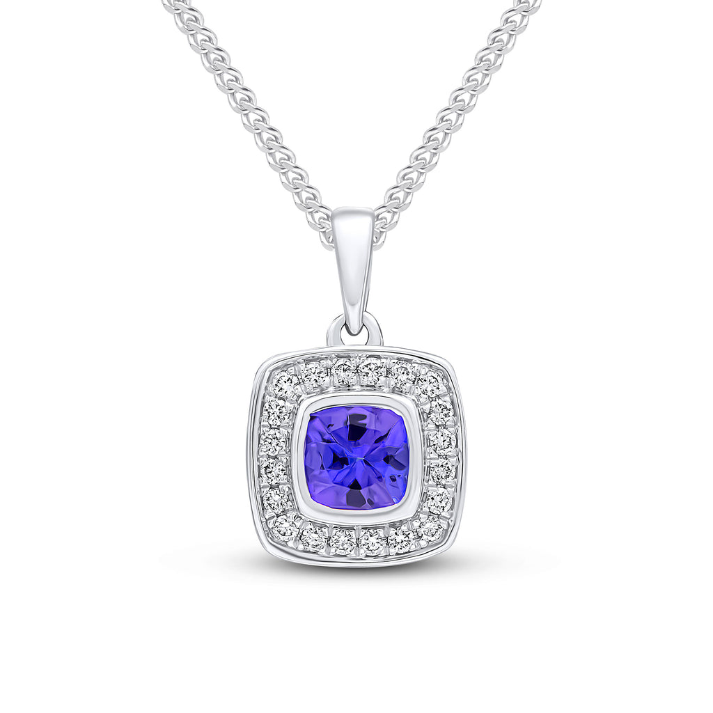 18CT White Gold Rubover Cushion Tanzanite & Grain Set Diamond Cluster Pendant 4mm
