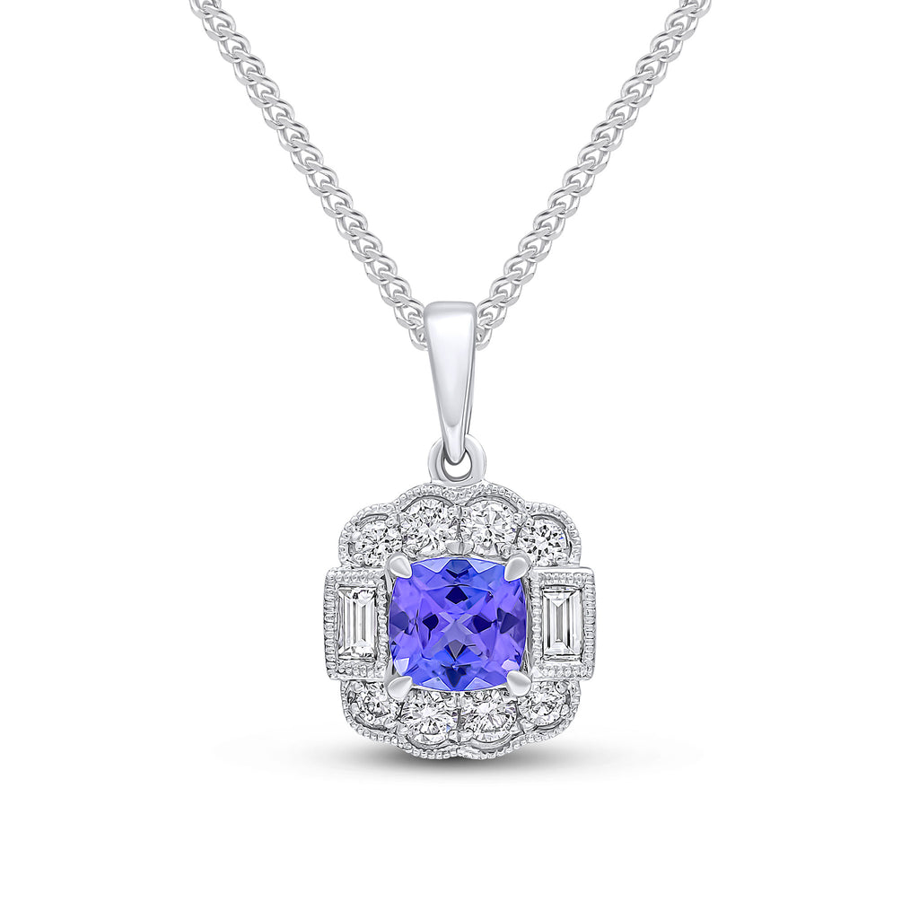 18CT White Gold Cushion Tanzanite, Baguette & Round Diamond Millegrain Fancy Cluster Pendant 5mm