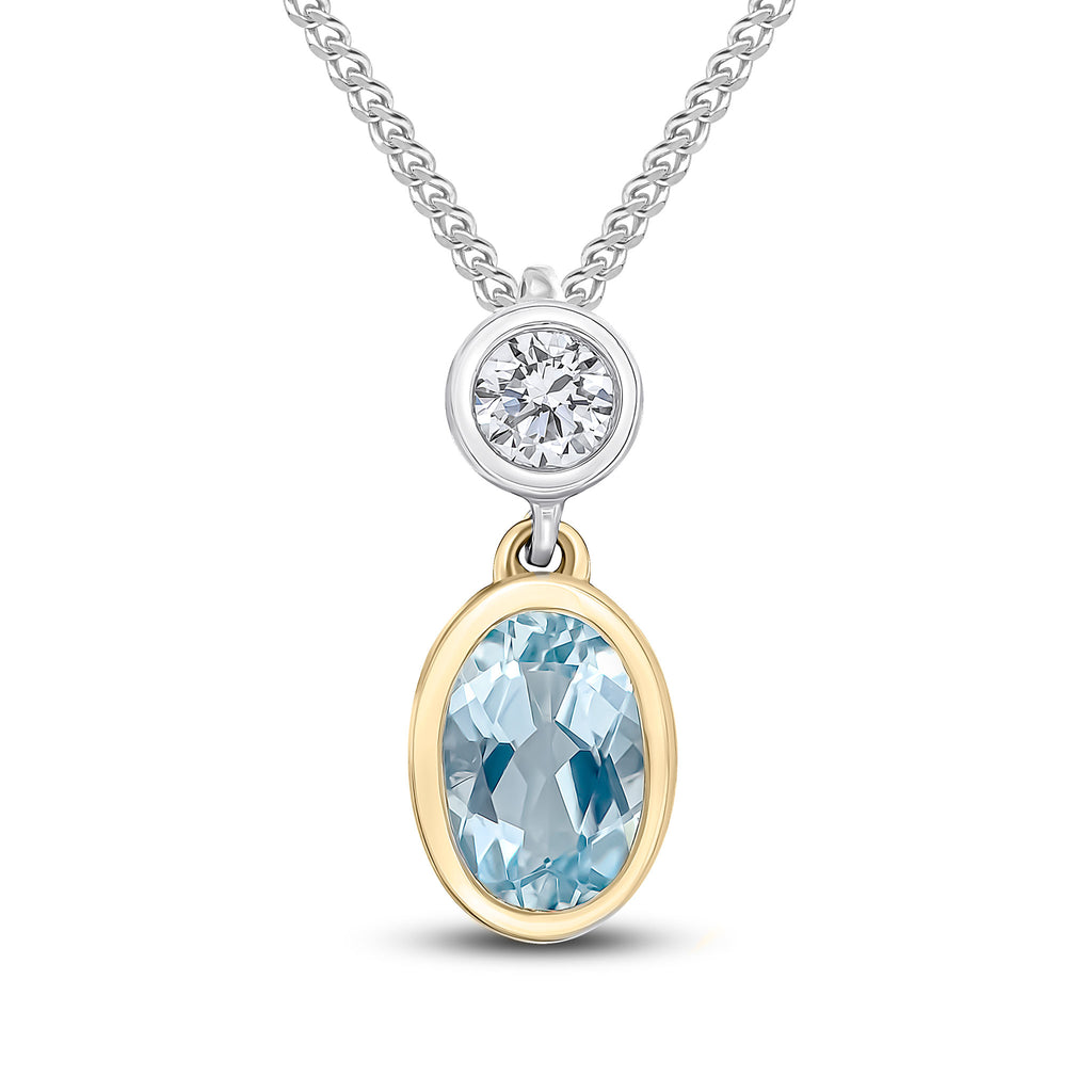 18CT Yellow Gold Oval Aquamarine & Round Diamond Two Stone Pendant 6x4mm