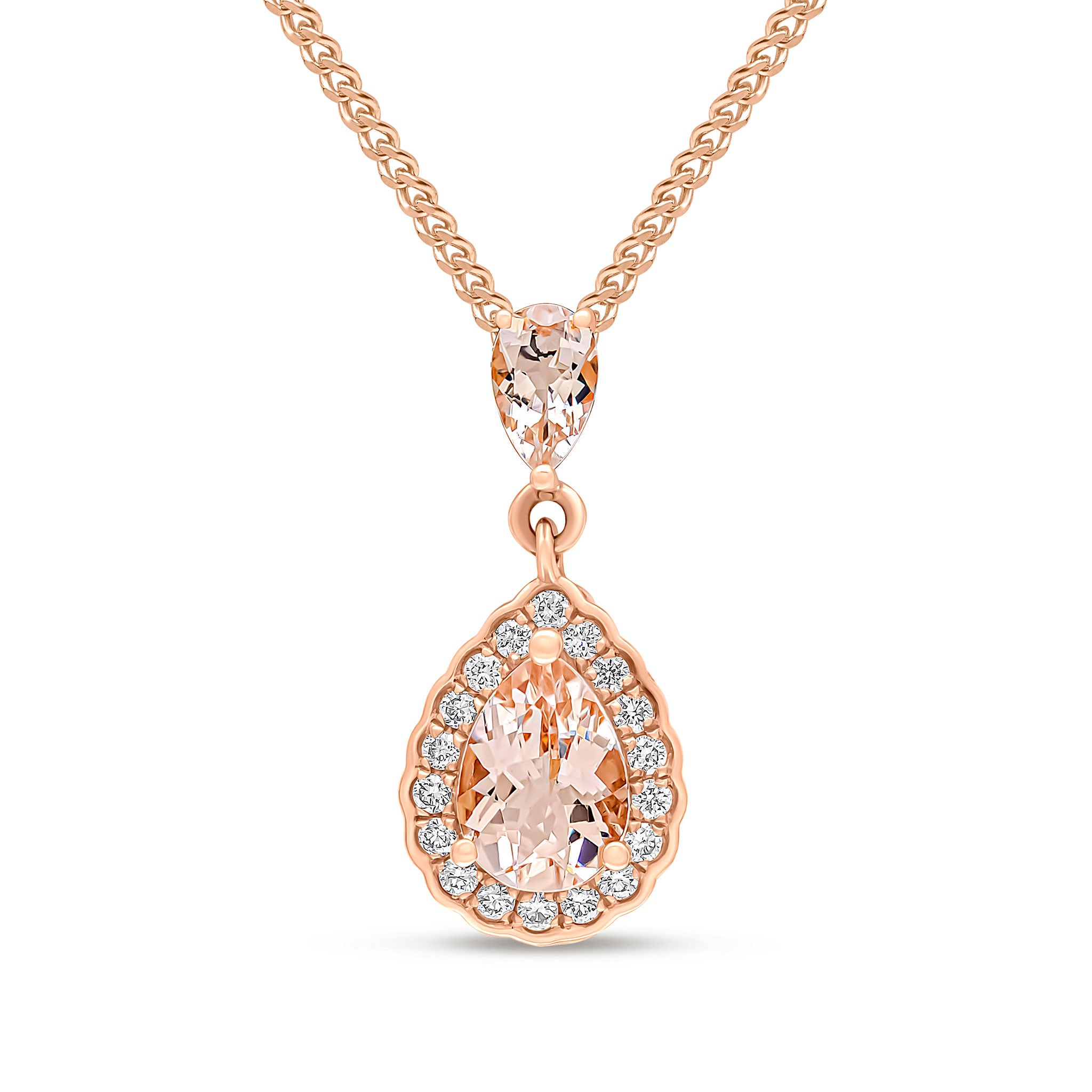 18CT Rose Gold Two Stone Pear Shaped Morganite & Diamond Cluster Drop Pendant