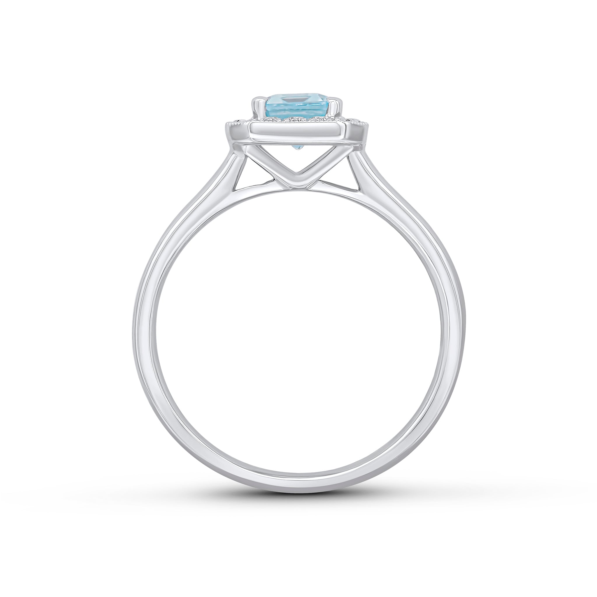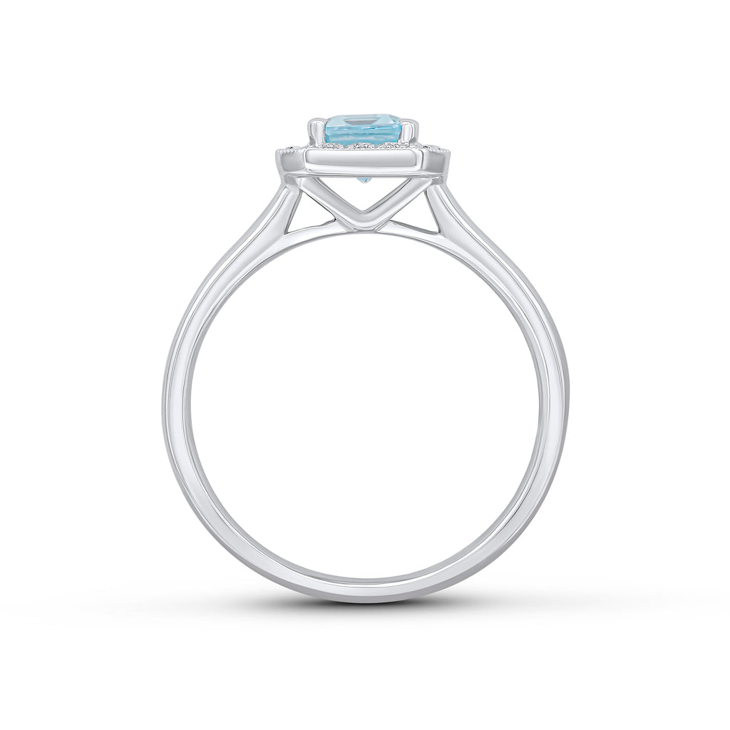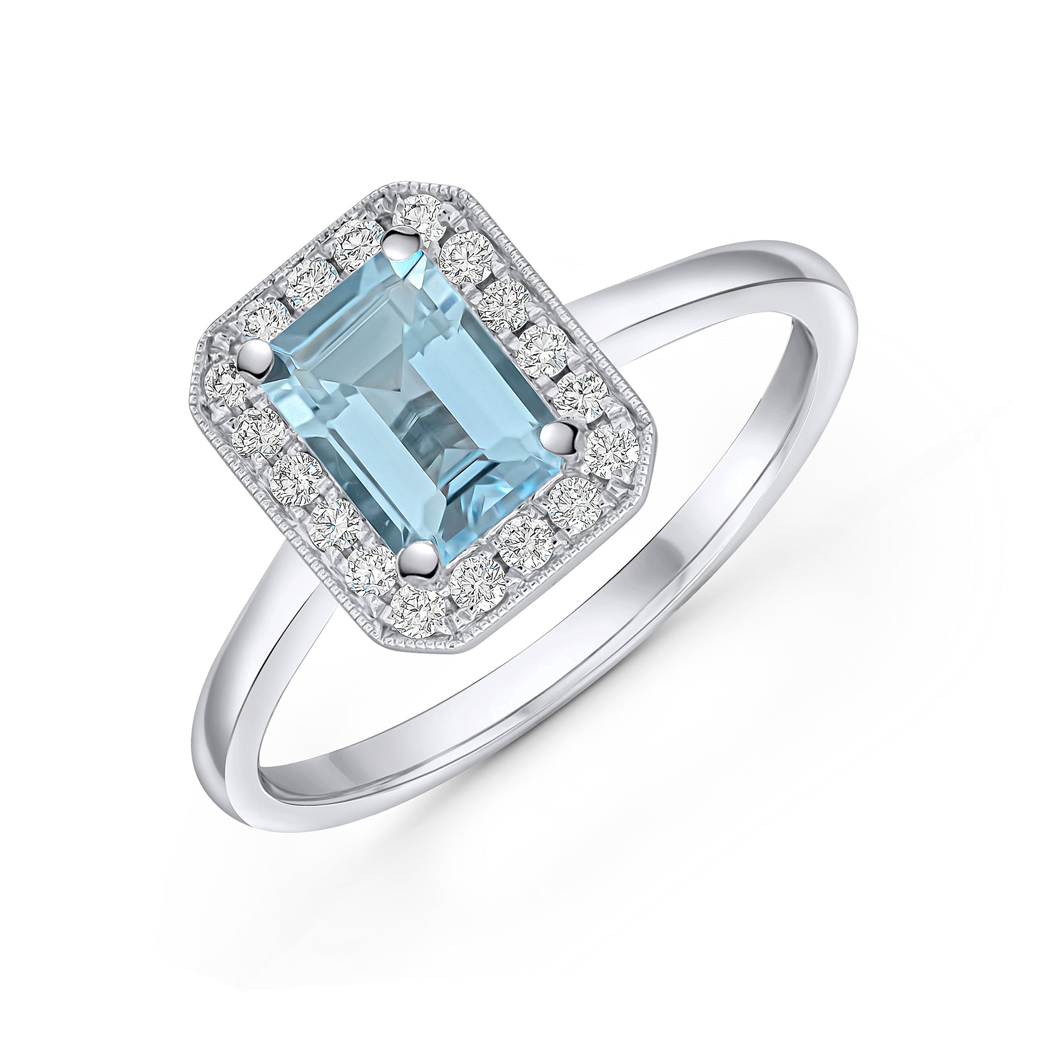 18CT White Gold Claw Set Octagonal Aquamarine & Millegrain Diamond Cluster Ring 7x5mm