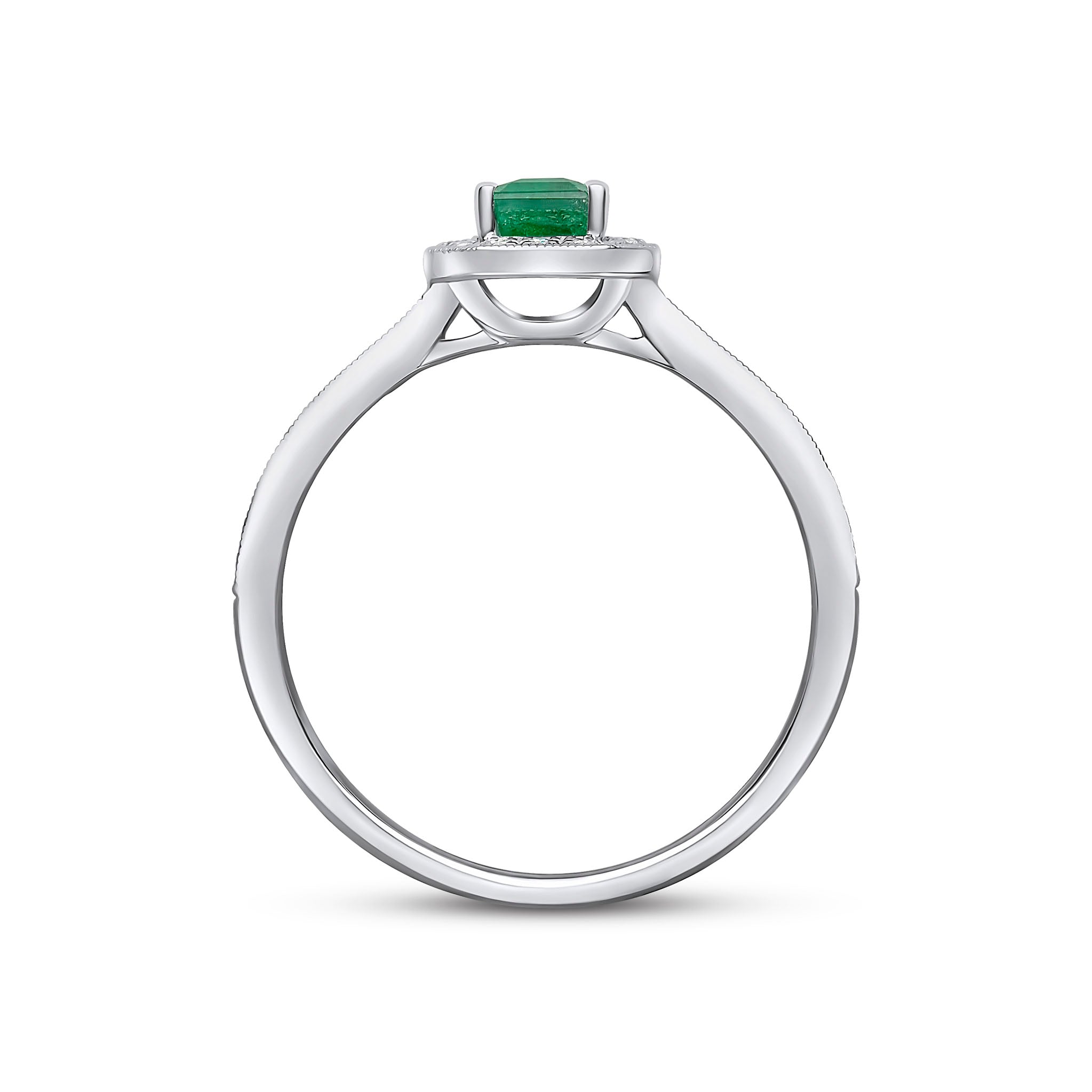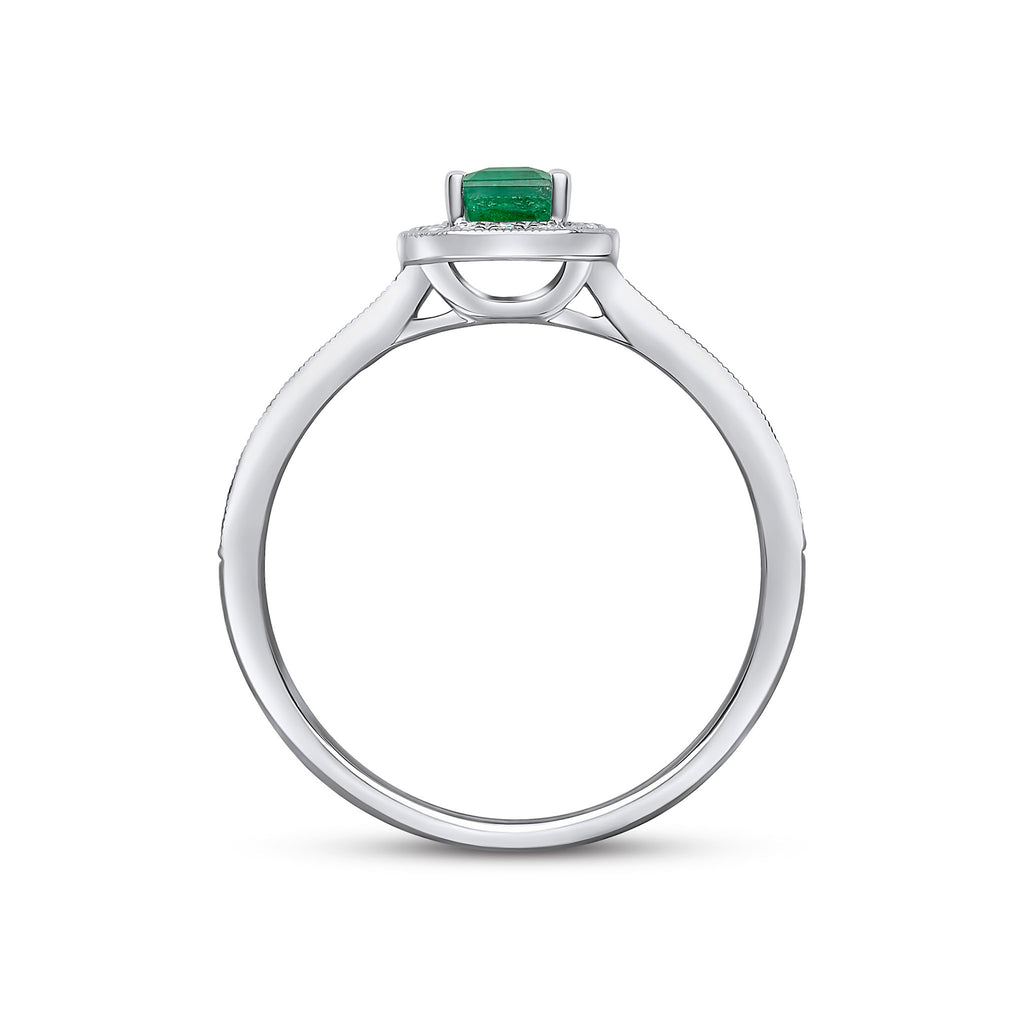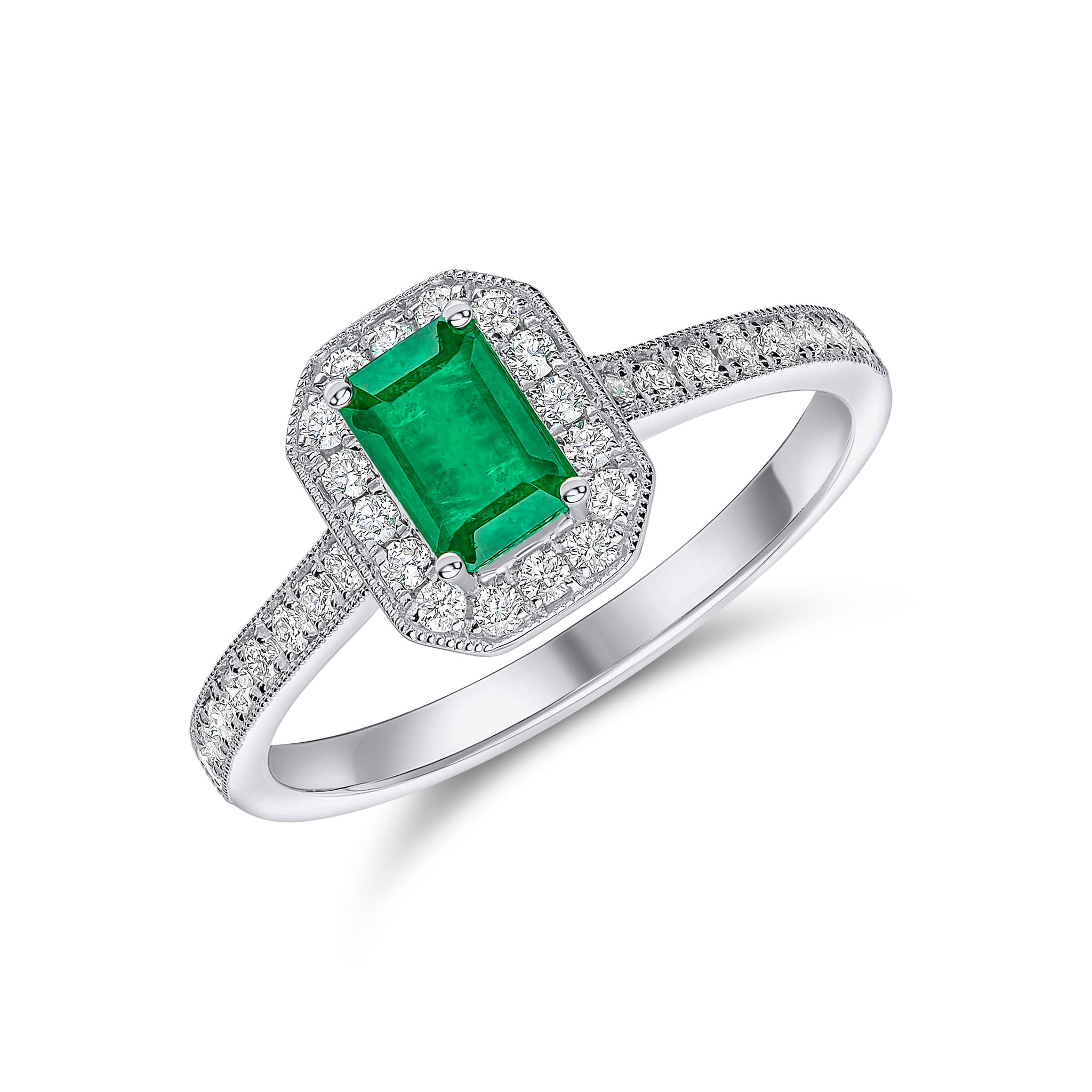 18CT White Gold Claw Set Octagonal Emerald & Millegrain Diamond Cluster Ring with Diamond Band 6x4mm