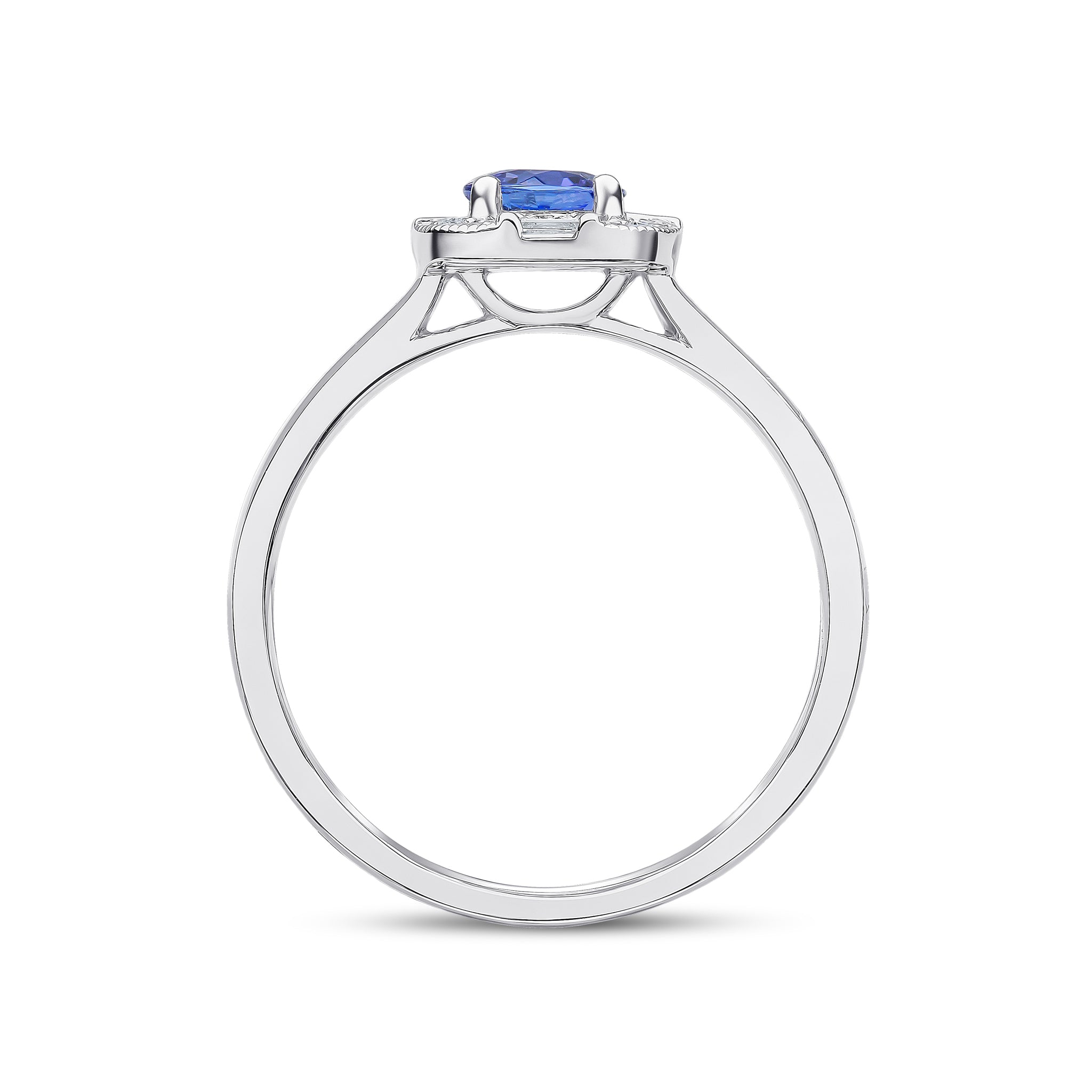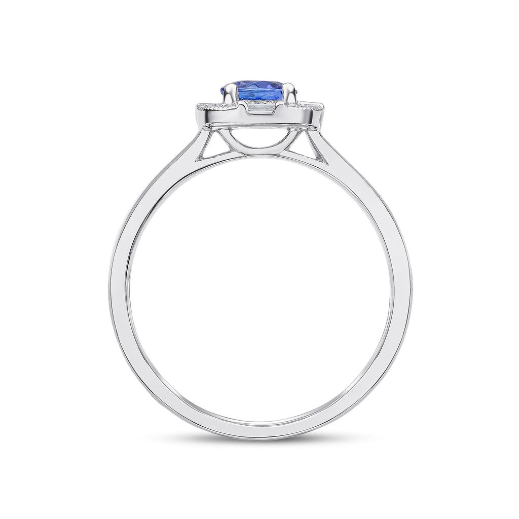 18CT White Gold Claw Set Round Tanzanite, Bar Set Baguette & Millegraine Edge Round Diamond Fancy Cluster Ring 5mm