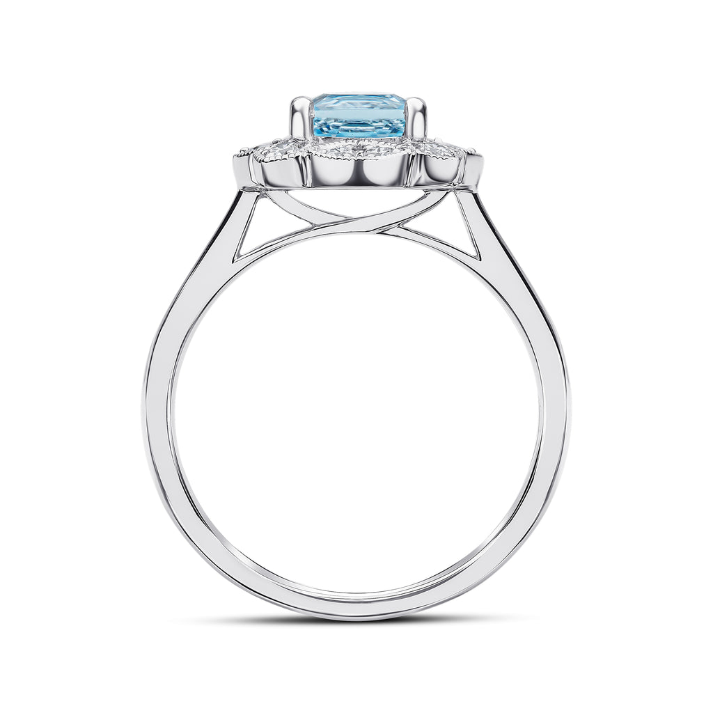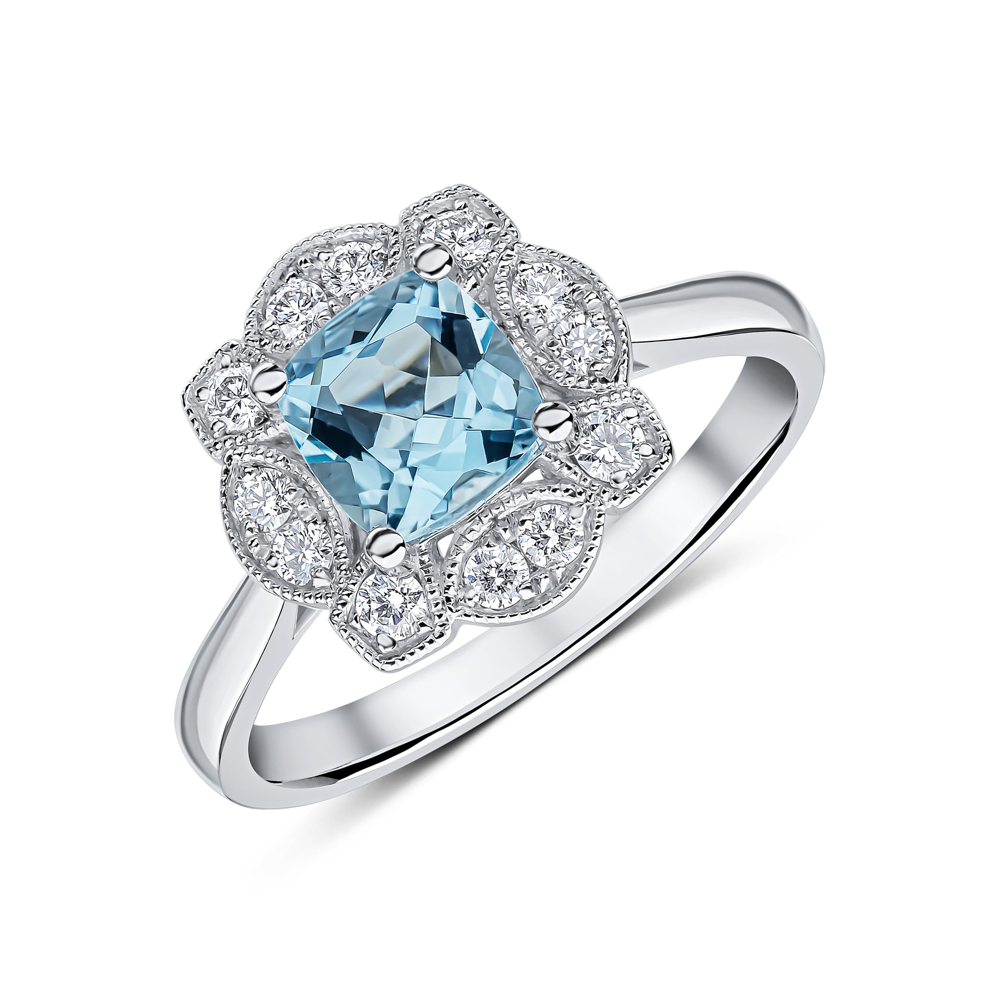 18CT White Gold Cushion Aquamarine & Round Diamond Millegrain Cluster Ring 6mm