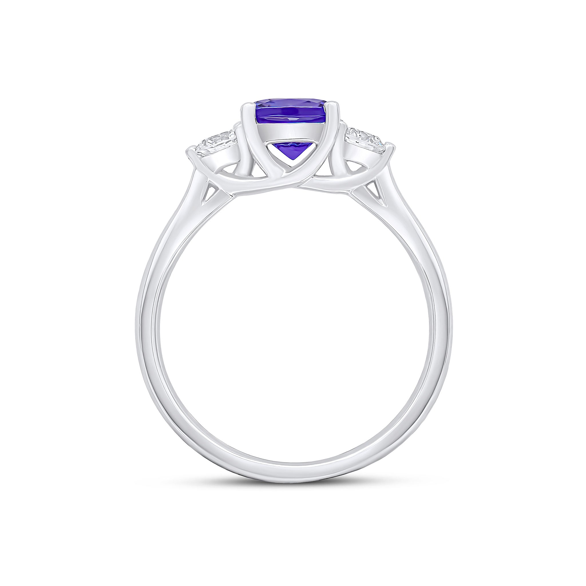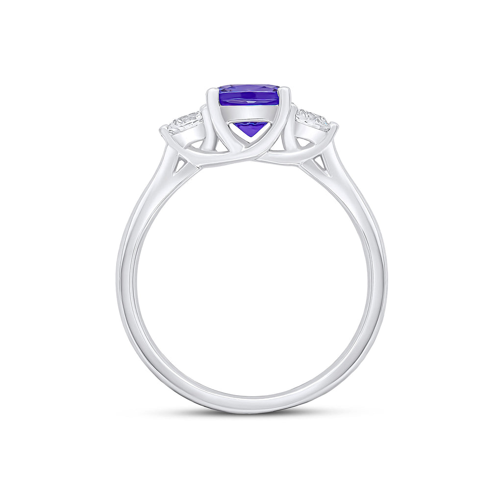 18CT White Gold Cushion Tanzanite & Round Diamond Three Stone Ring 6mm