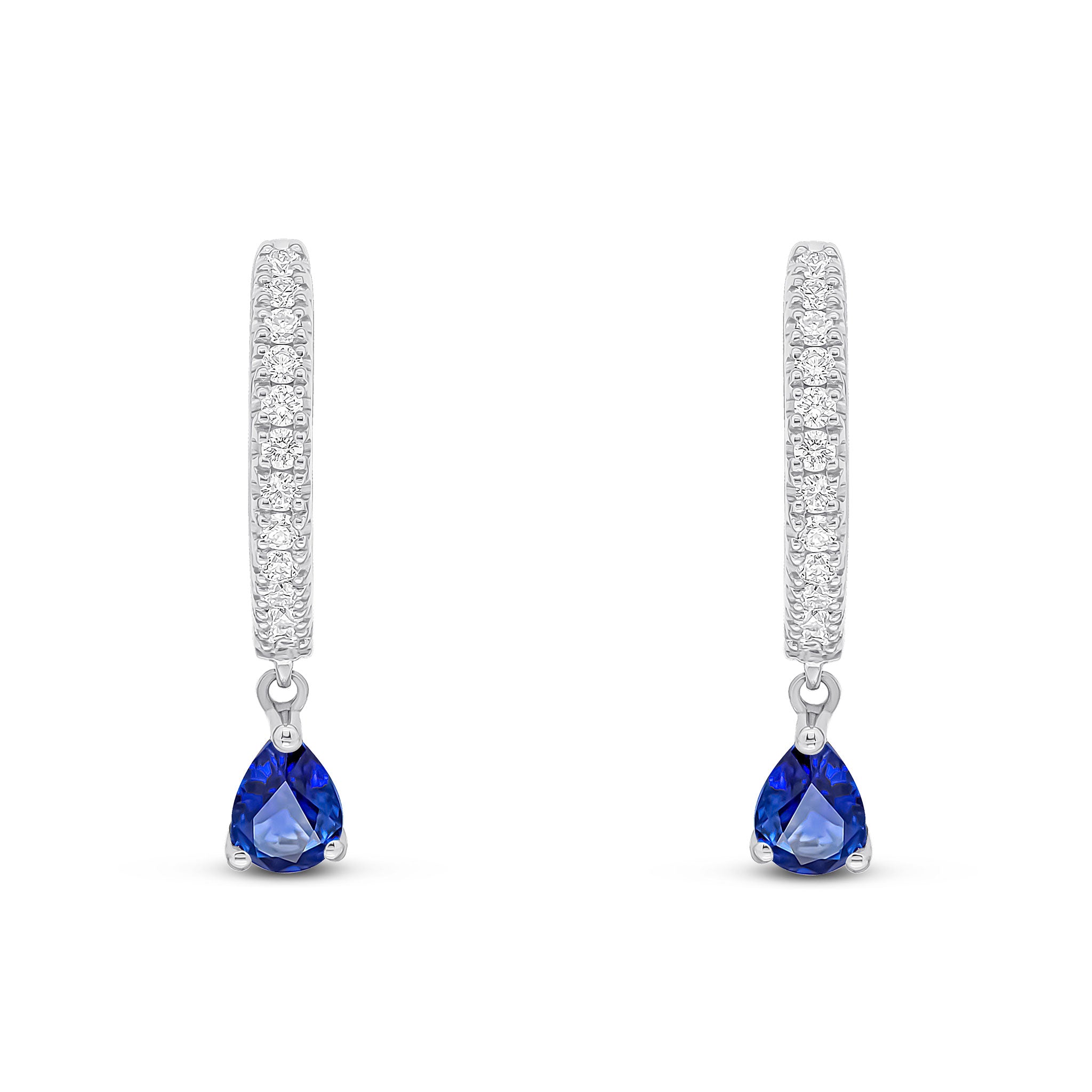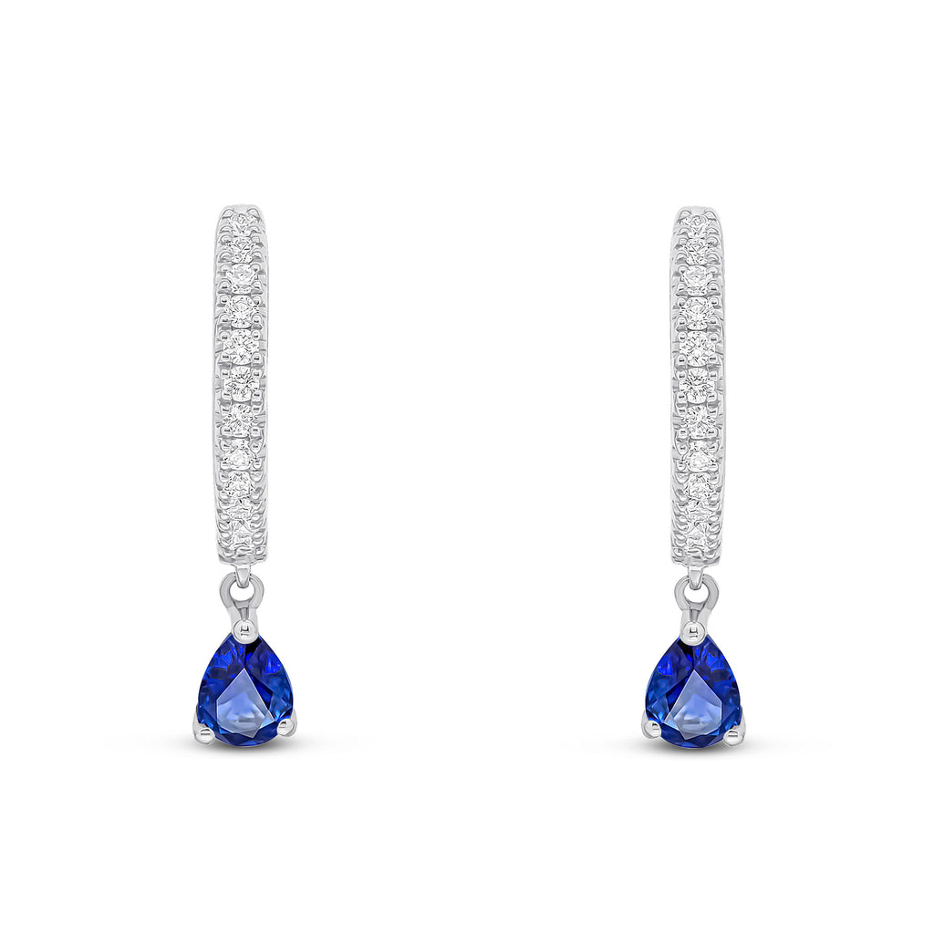 18CT White Gold Diamond Hoop Earrings with Pear Shape Sapphire Drop
