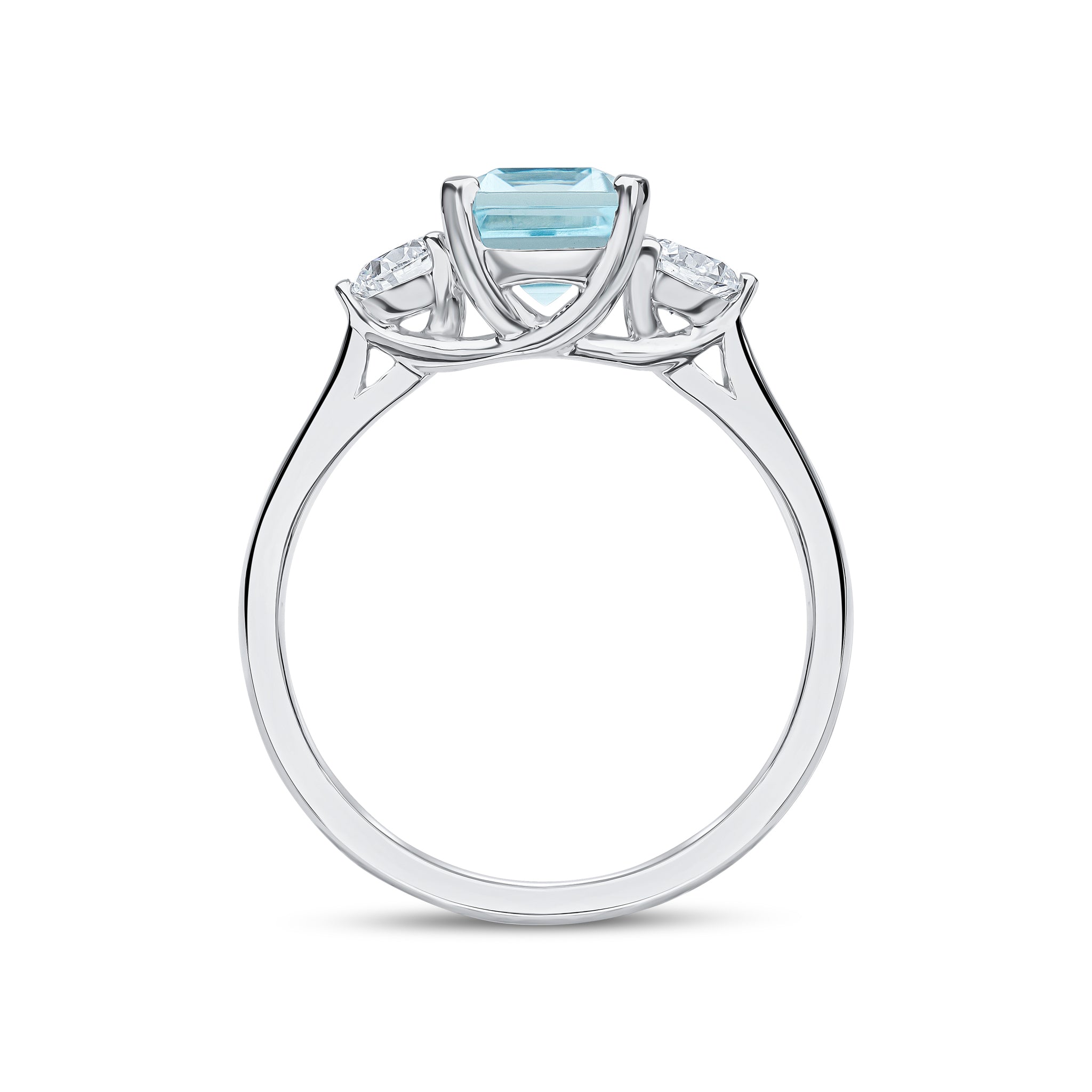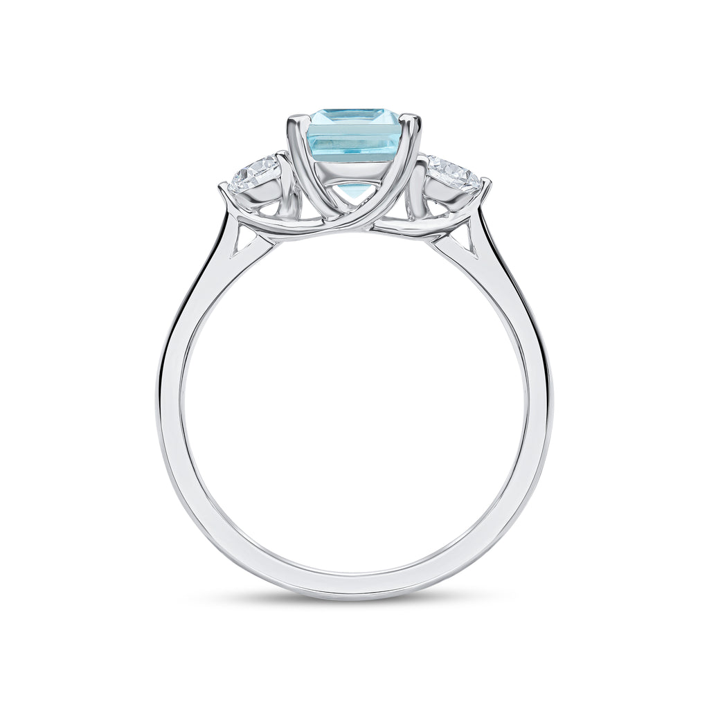 18CT White Gold Octagonal Aquamarine & Round Diamond Claw Set Three Stone Ring 8x6mm