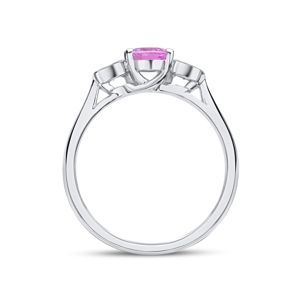 18CT White Gold Oval Pink Sapphire & Rubover Round Diamond Three Stone Ring 7x5mm
