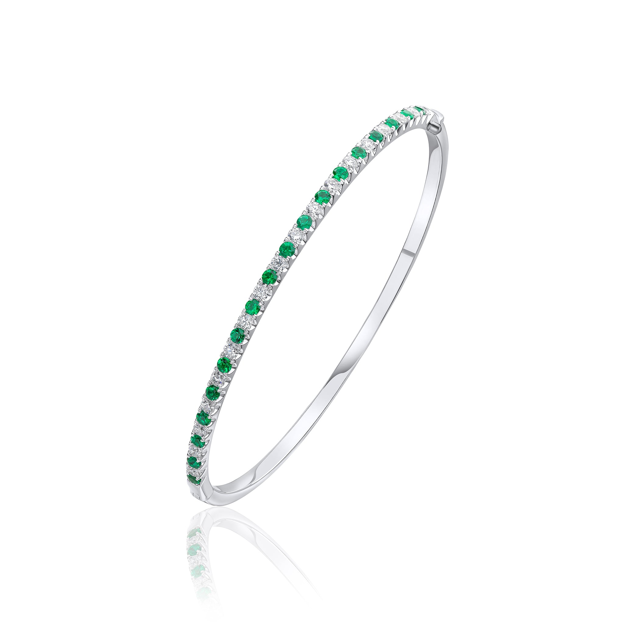 18CT White Gold Round Emerald & Diamond Claw Set Hinged Bangle