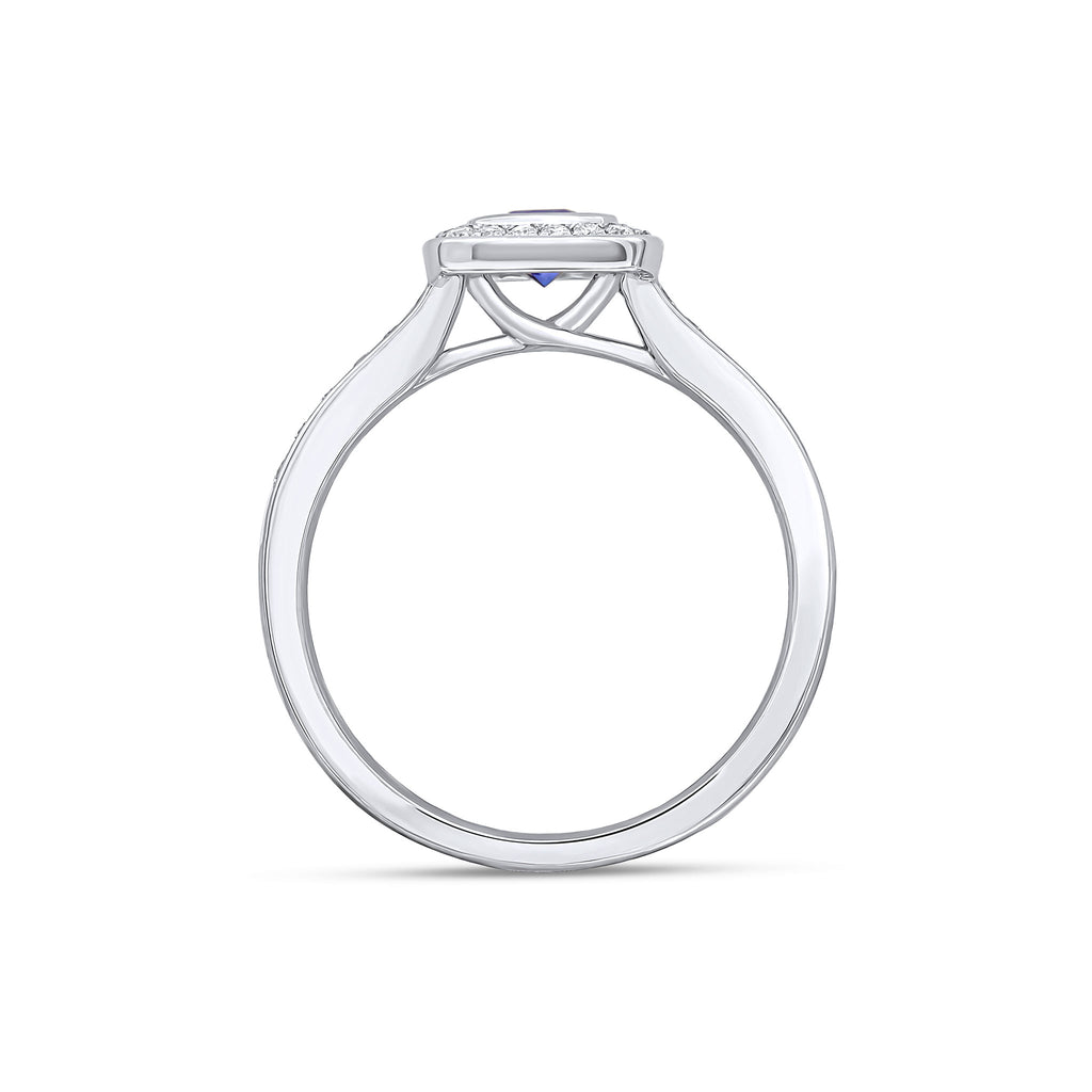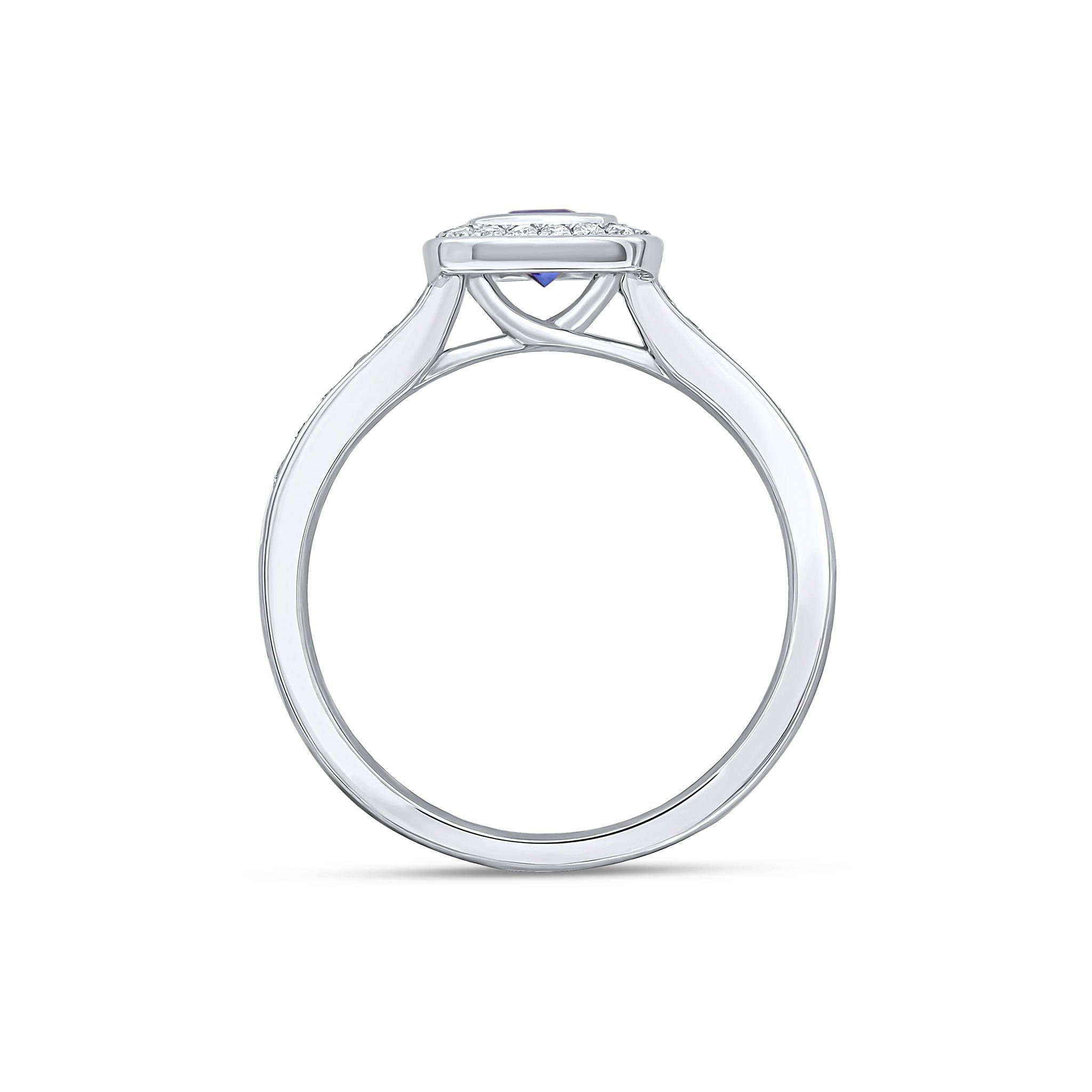 18CT White Gold Rubover Cushion Tanzanite & Grain Set Diamond Custer Ring with Stones on Shoulder 4mm