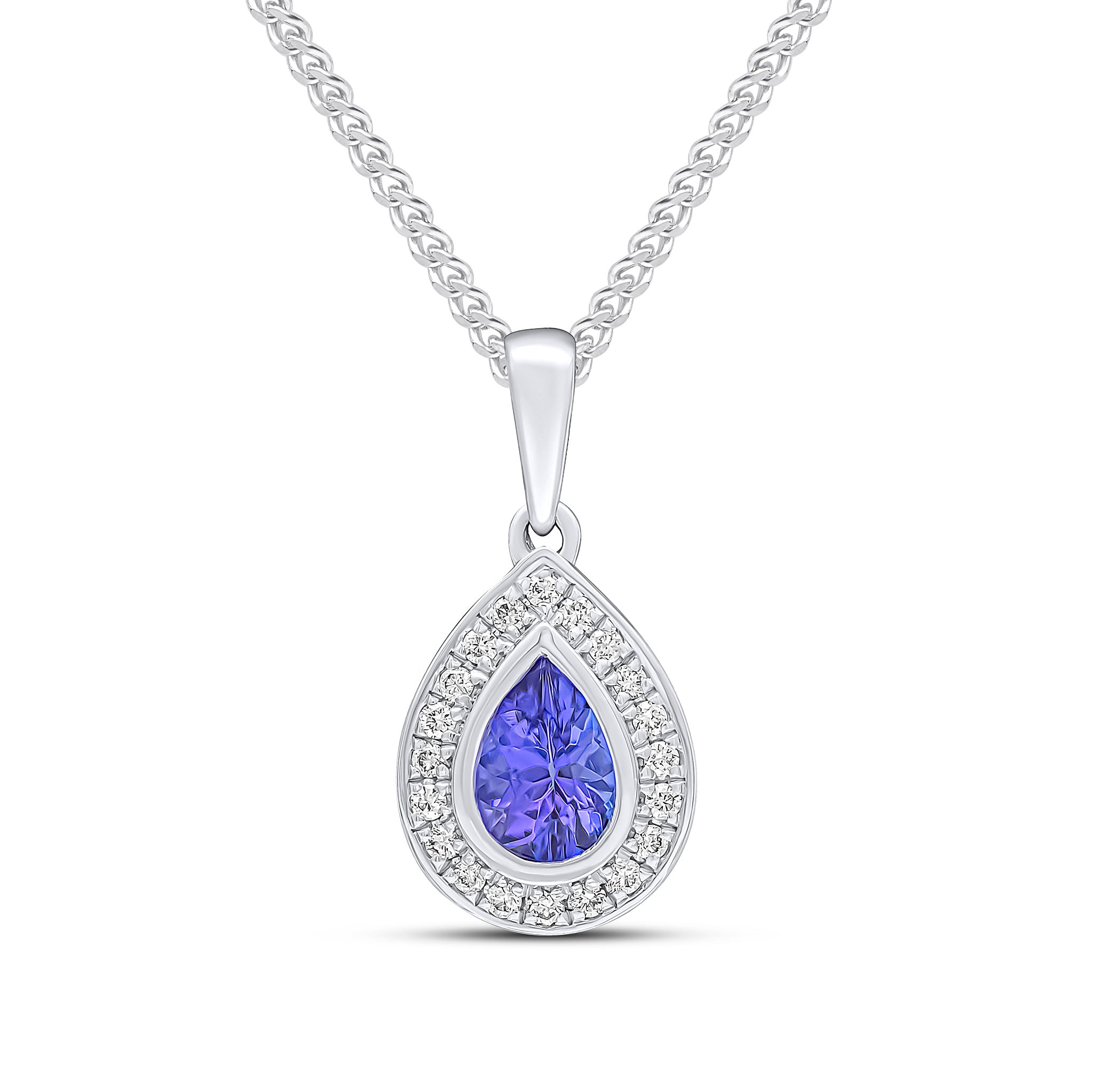 18CT White Gold Rubover Pear Shaped Tanzanite & Grain Set Round Diamond Cluster Pendant 6x4mm