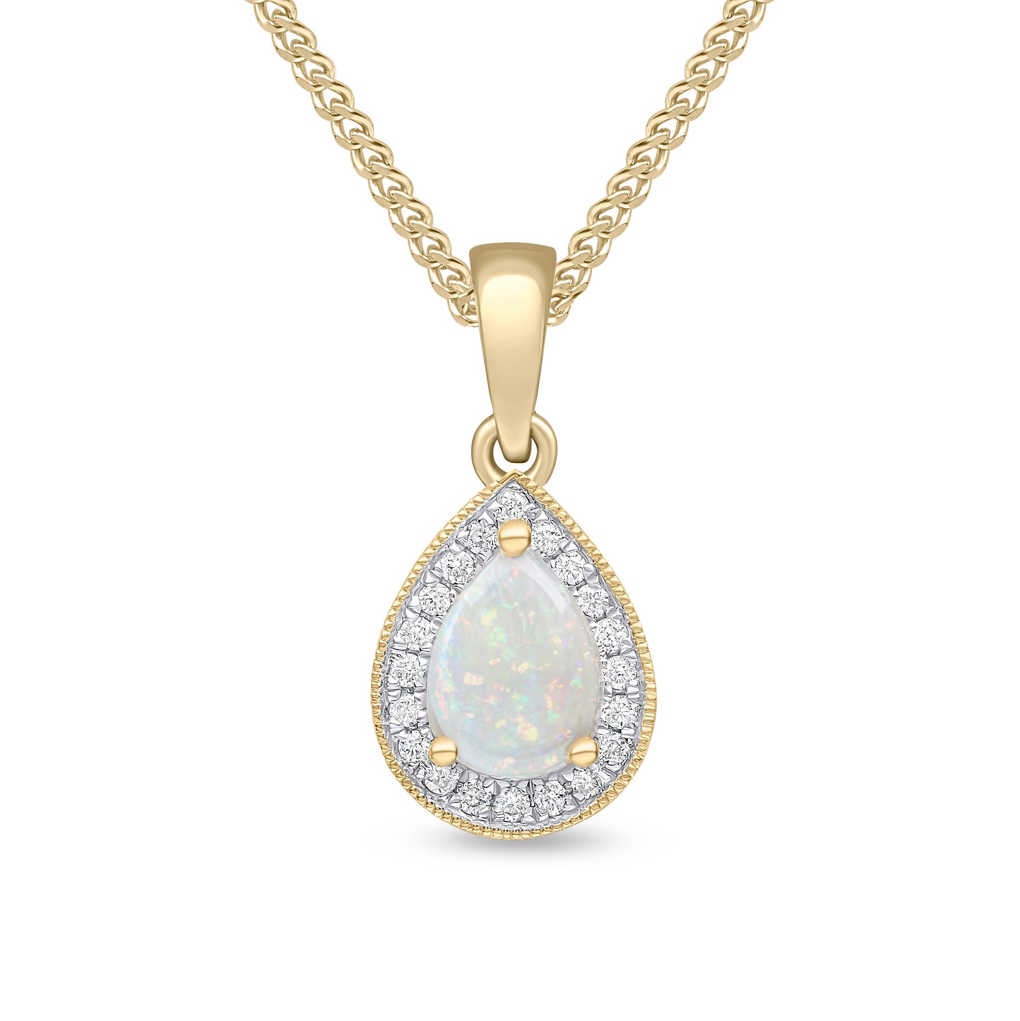 18CT Yellow Gold Claw Set Pear Shaped Opal & Round Diamond Cluster Pendant with Millegrain Edge 7x5mm