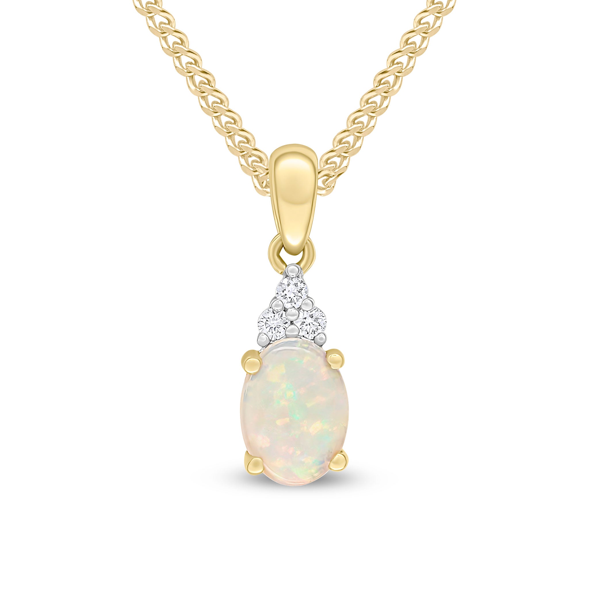 18CT Yellow Gold Oval Opal & Diamond Trefoil Top Pendant 7x5mm