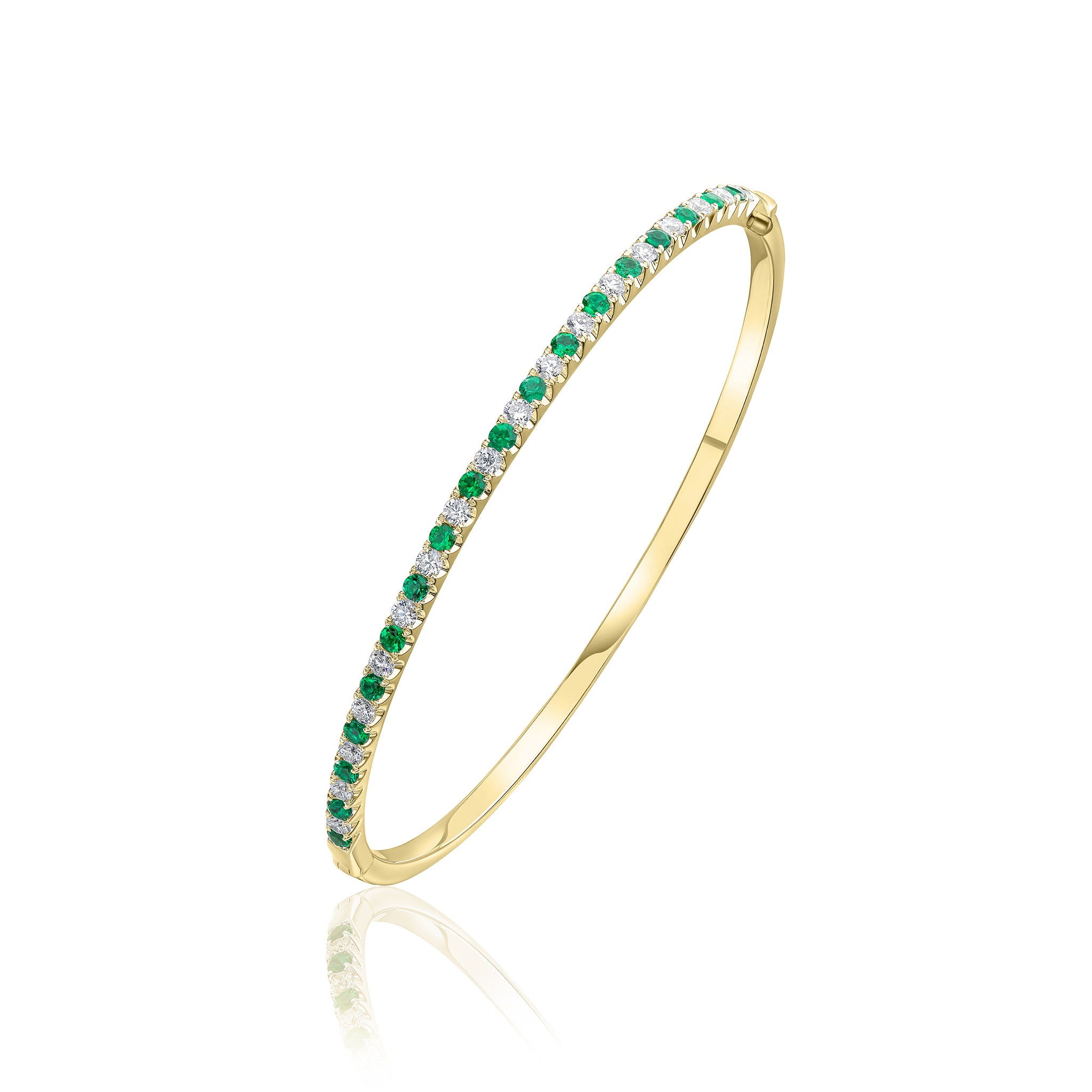 18CT Yellow Gold Round Emerald & Diamond Claw Set Hinged Bangle