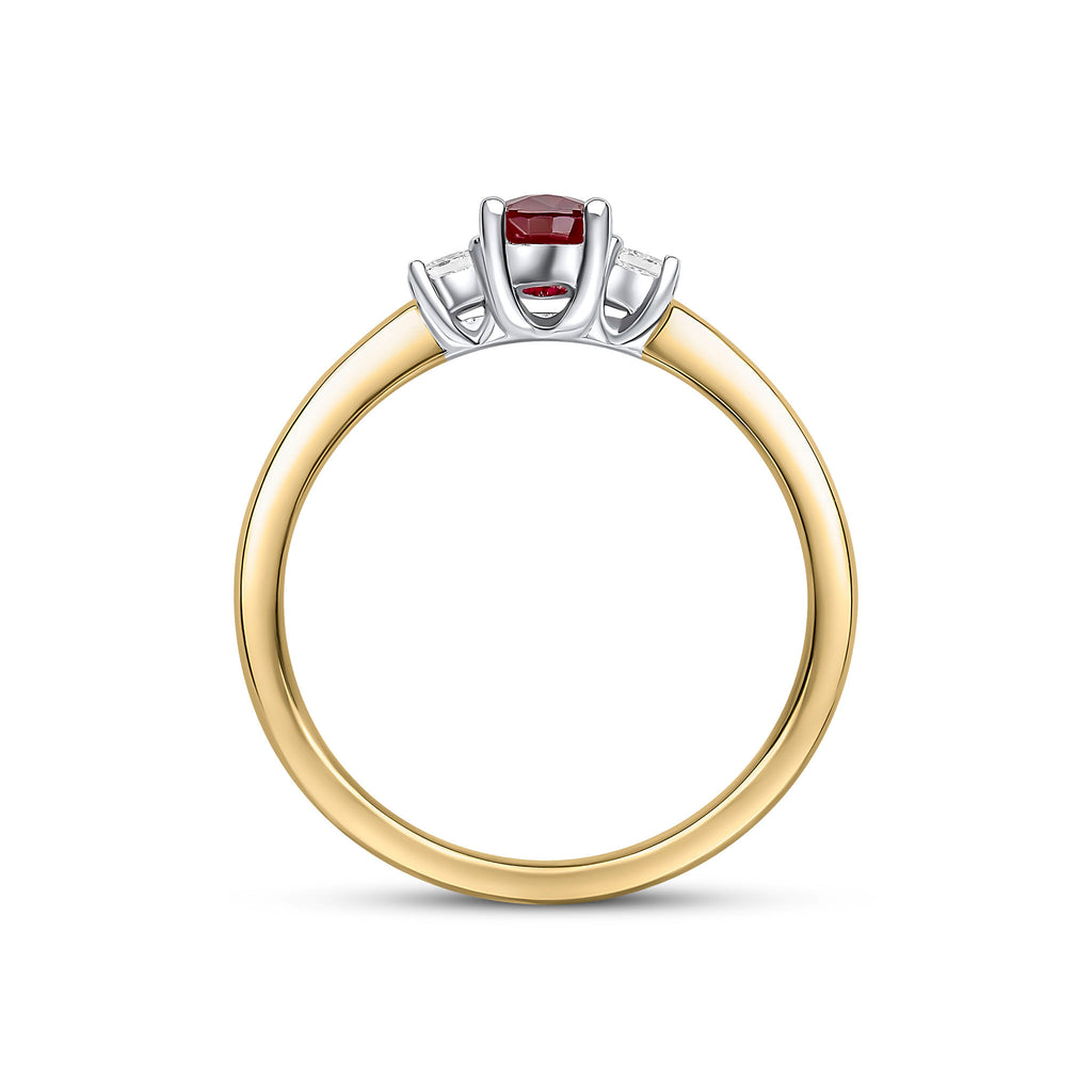 18CT Yellow & White Gold Oval Ruby & Princess Cut Diamond Claw Three Stone Ring 6x4mm