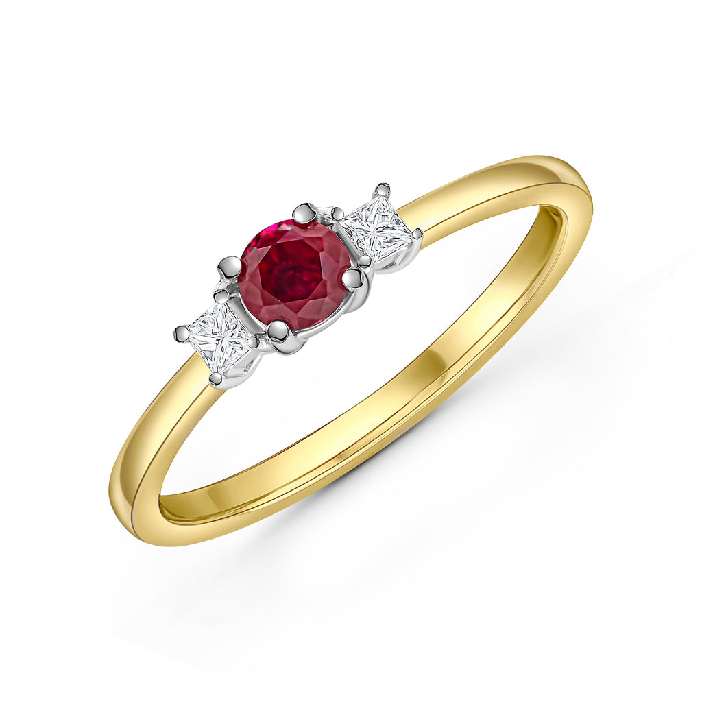 18CT Yellow & White Gold Round Ruby & Princess Cut Diamond Claw Three Stone Ring 4mm