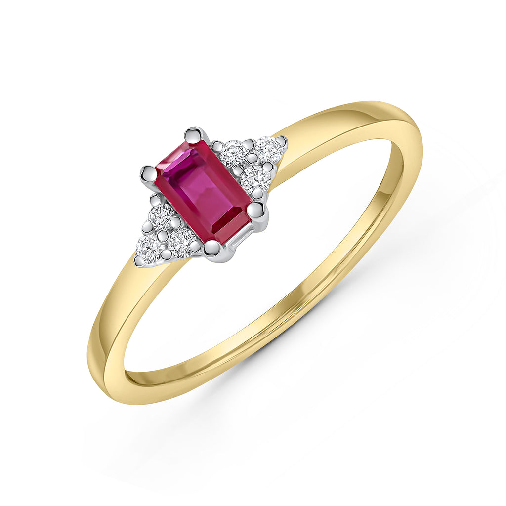 18CT Yellow & White Gold Octagonal Ruby & Round Diamond Claw Three Stone Ring 5x3mm