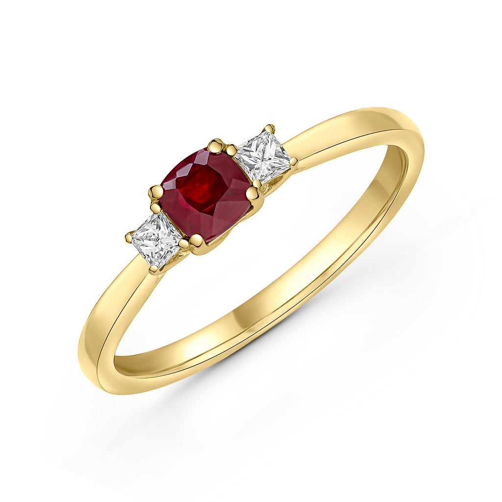 18CT Yellow & White Gold Cushion Ruby & Square Diamond Three Stone Ring 4mm