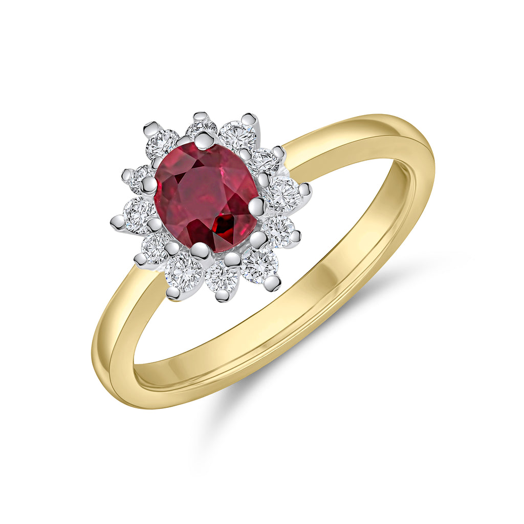 18CT Yellow & White Gold Oval Ruby & Round Diamond Claw Set Cluster Ring 6x5mm