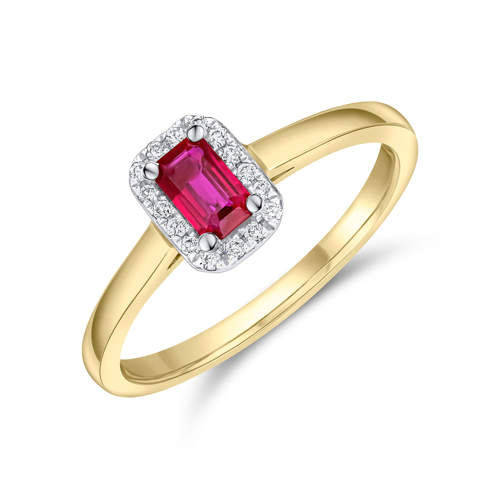 18CT Yellow & White Gold Octagonal Ruby & Round Diamond Claw Set Cluster Ring 5x3mm