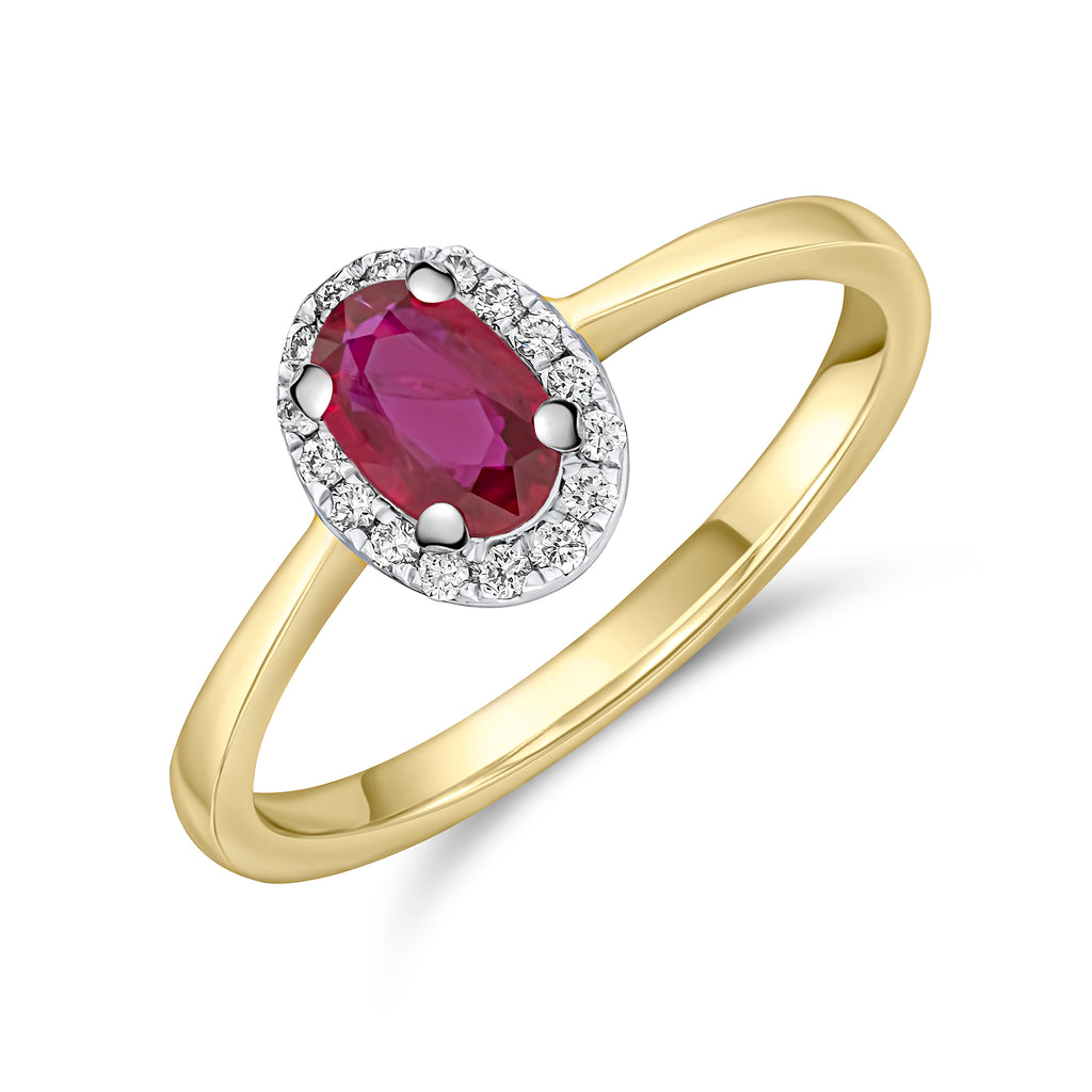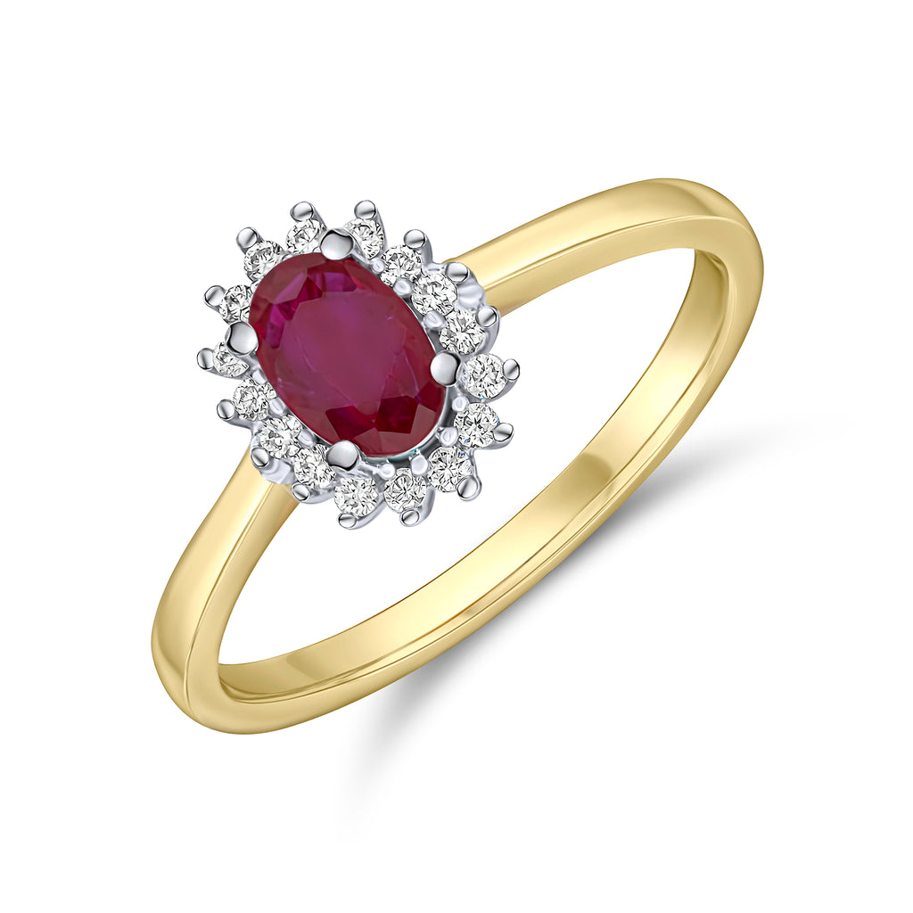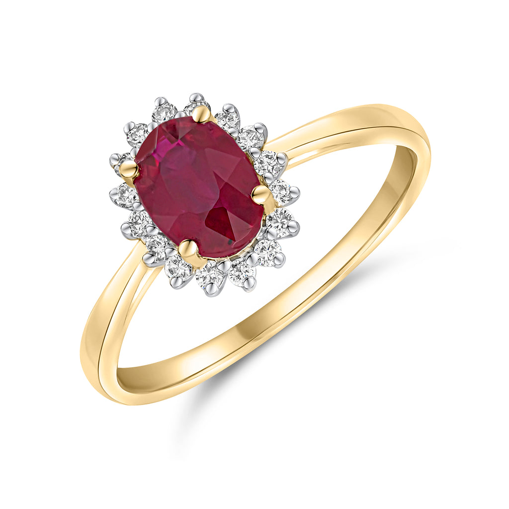 18CT Yellow Gold Oval Ruby & Round Diamond Claw Set Cluster Ring 7x5mm