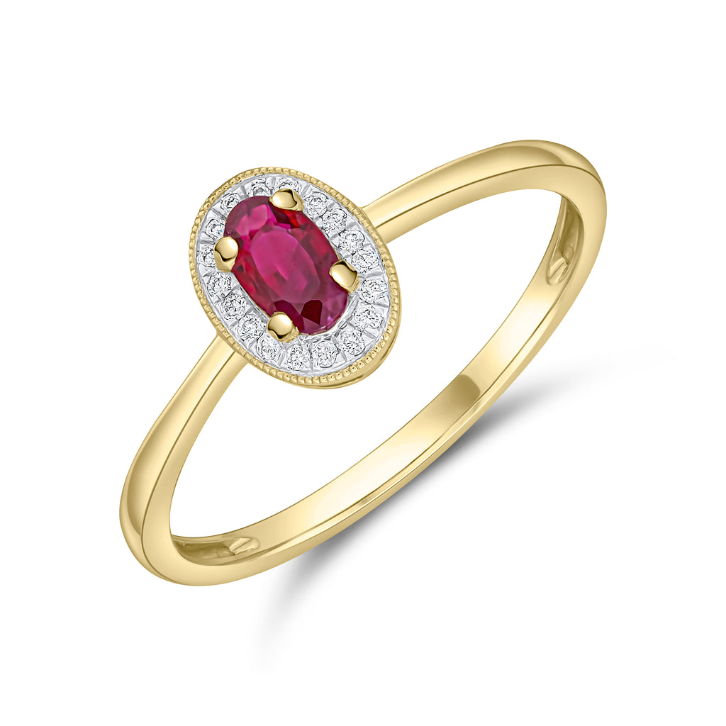 18CT Yellow Gold Claw Set Oval Ruby & Millegrain Diamond Cluster Ring 5x3mm