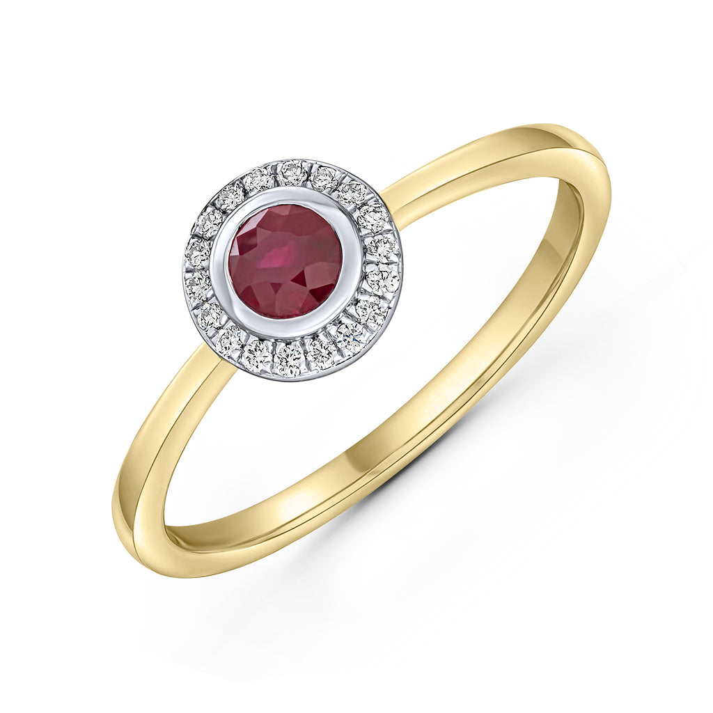 18CT Yellow & White Gold Rubover Round Ruby & Grain Set Diamond Cluster Ring 4mm