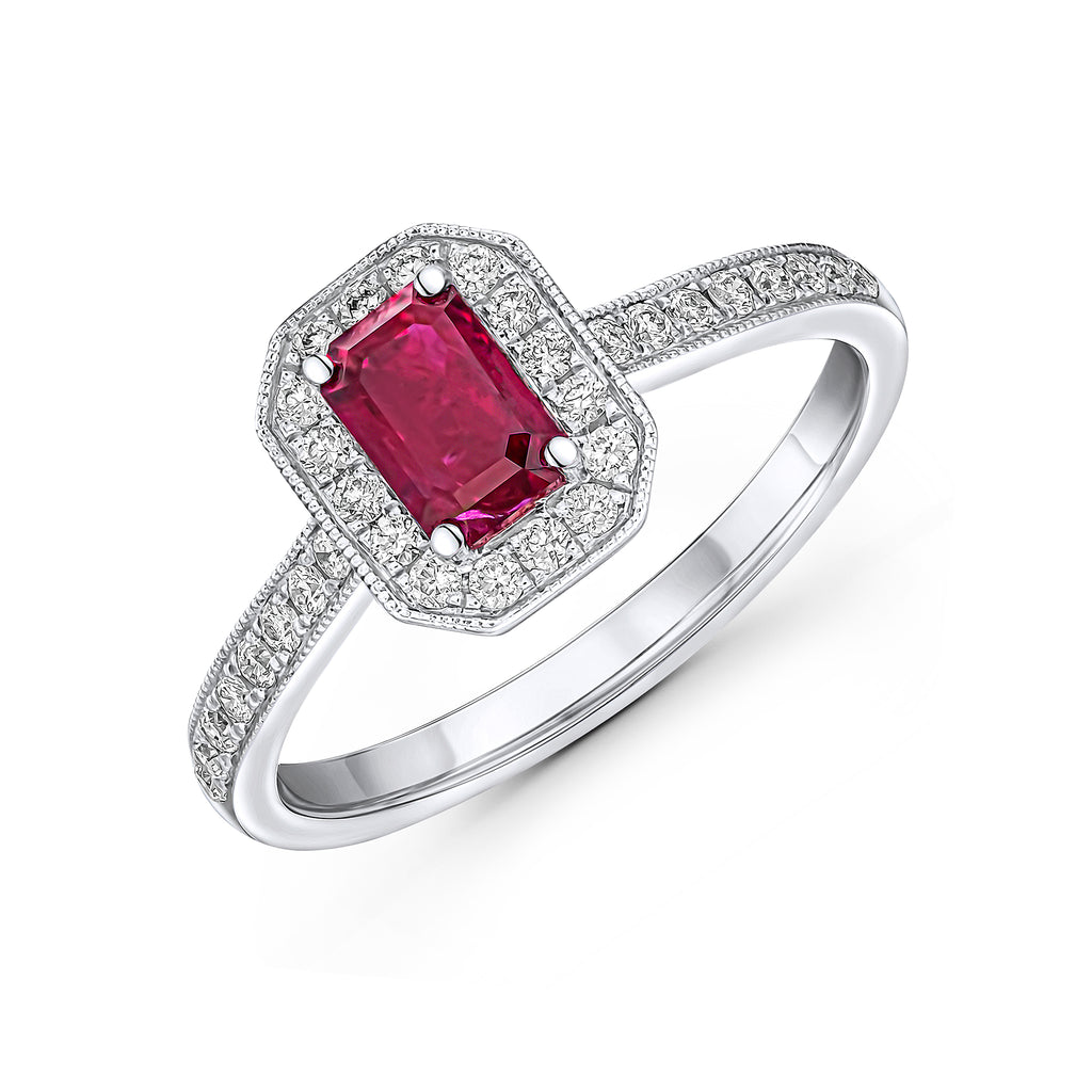 18CT White Gold Claw Set Octagonal Ruby & Millegrain Diamond Cluster Ring with Diamond Band 6x4mm