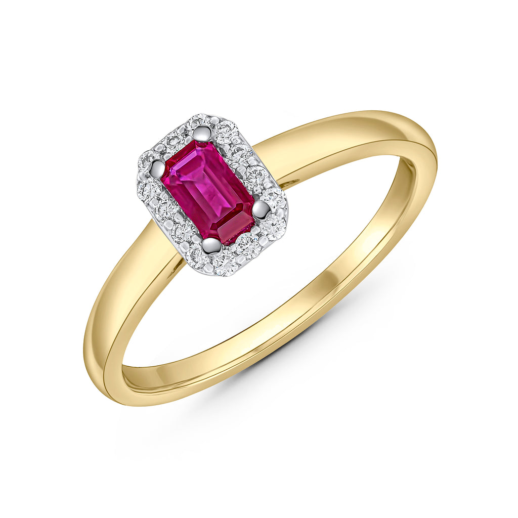 18CT Yellow & White Gold Octagonal Ruby & Round Diamond Claw Set Cluster Ring 5x3mm