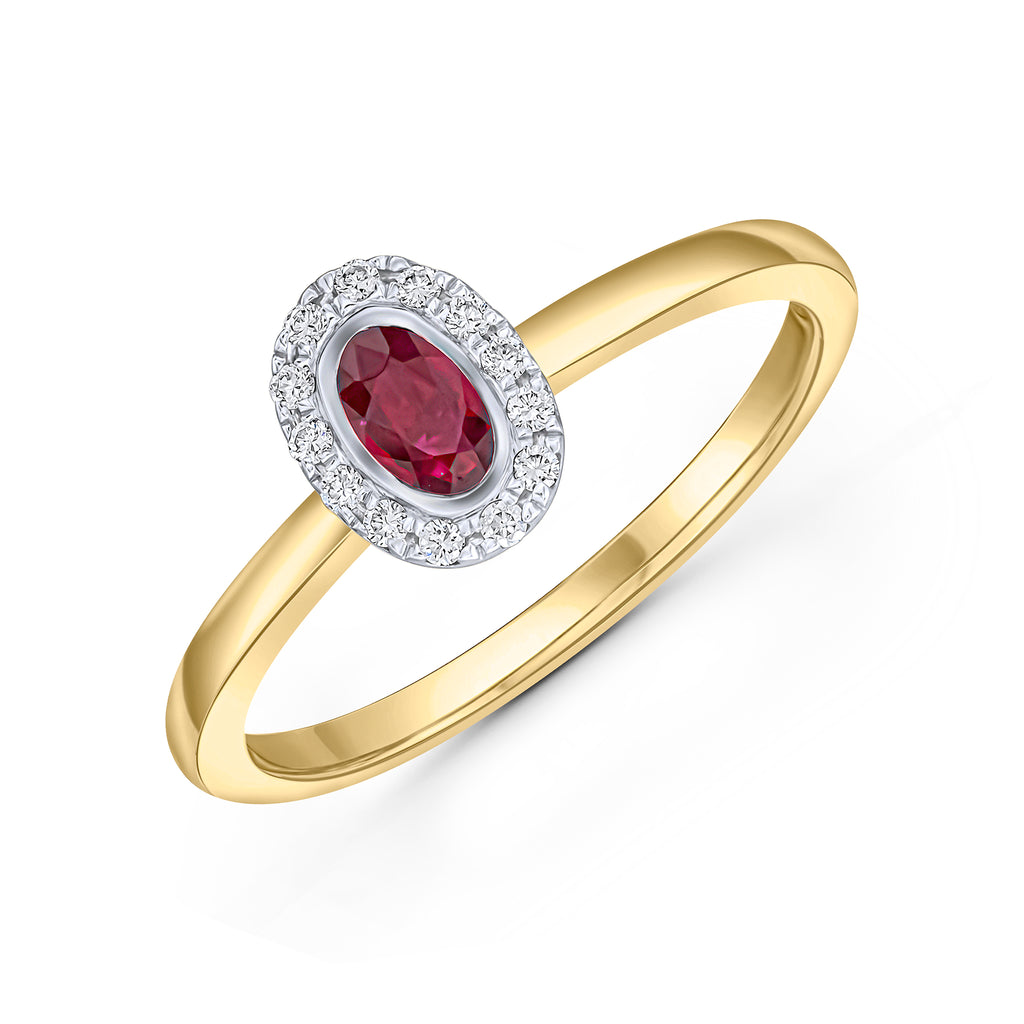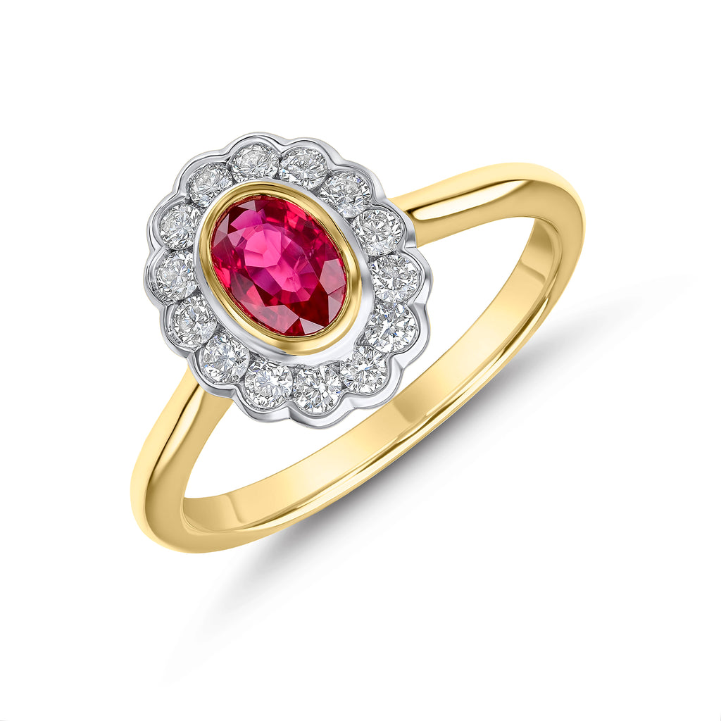 18CT Yellow & White Gold Oval Ruby & Round Diamond Rubover Scalloped Edge Ring 6x4mm