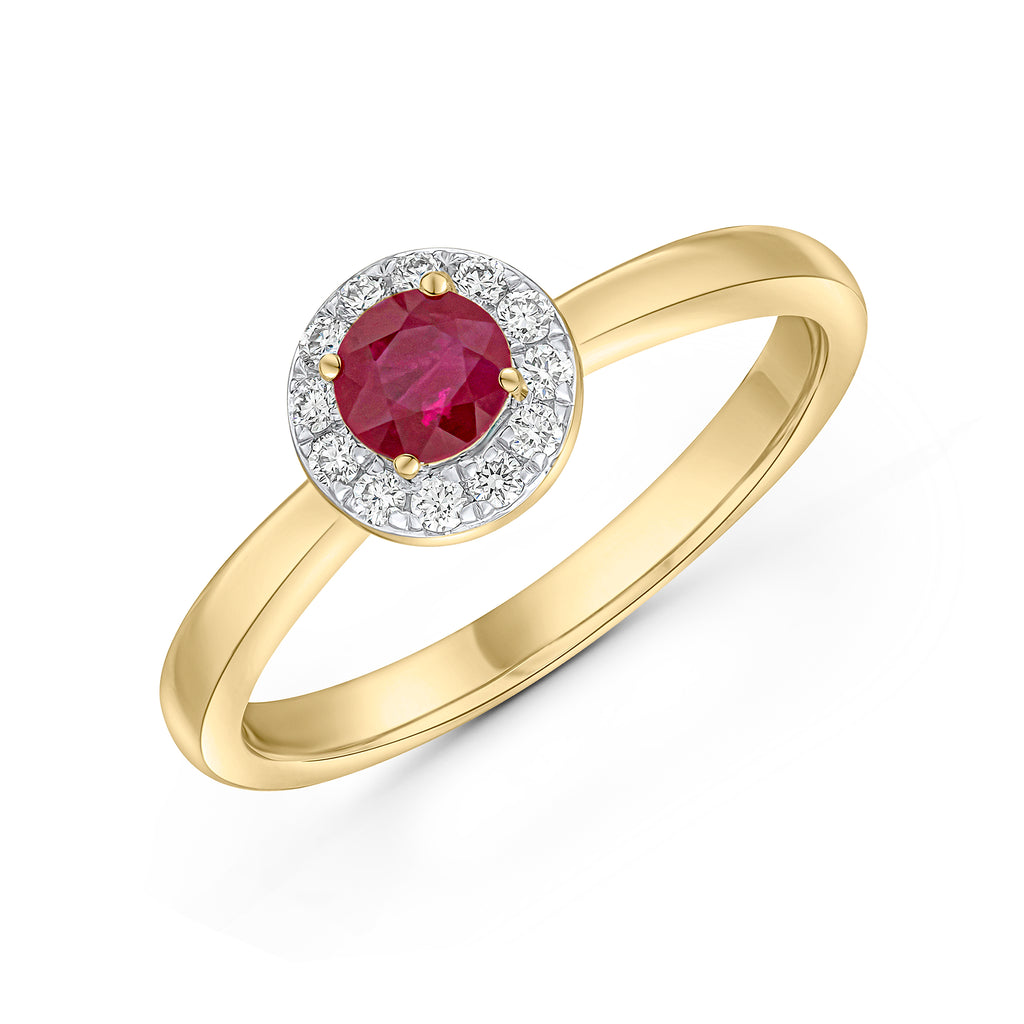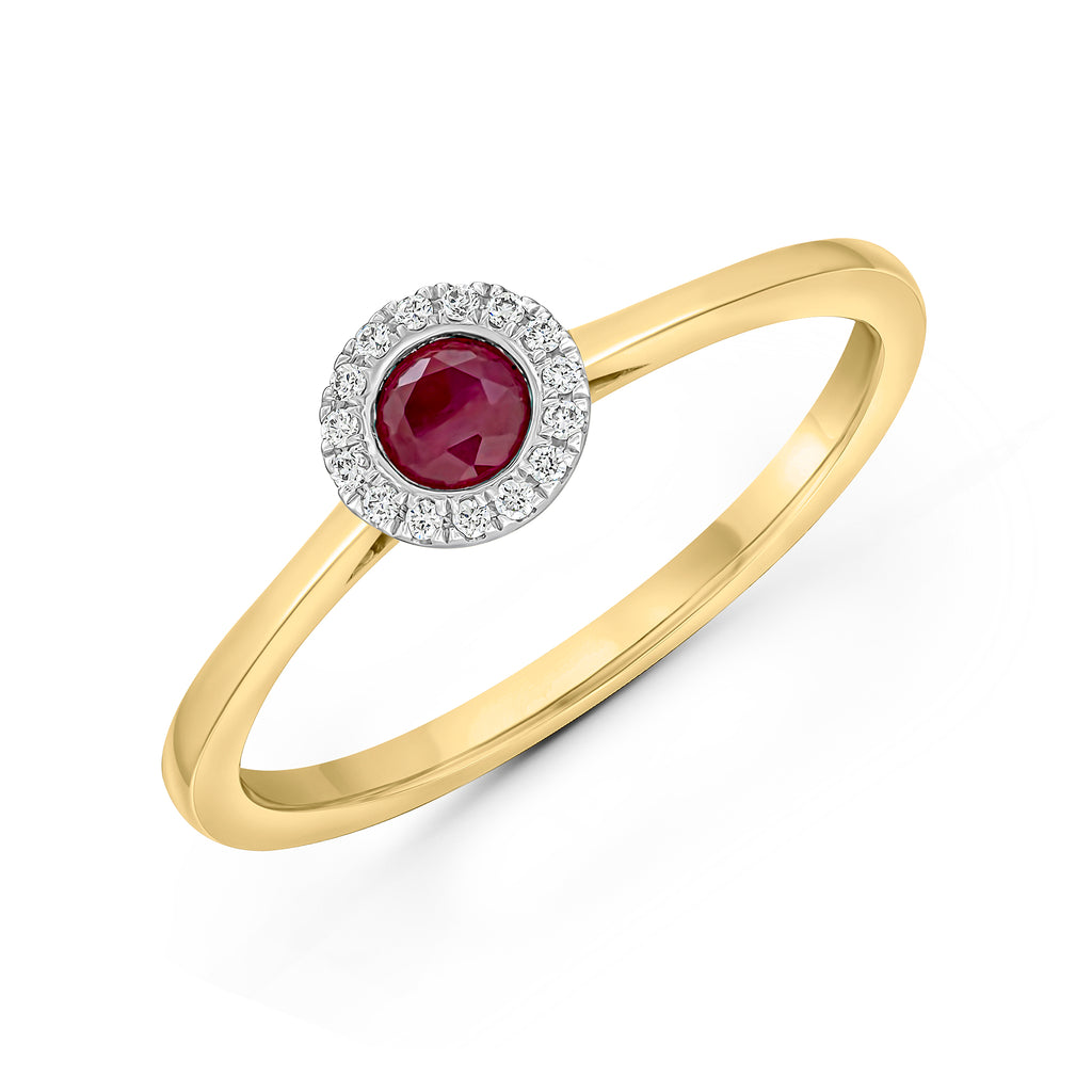 18CT Yellow & White Gold Rubover Round Ruby & Micro Set Diamond Cluster Ring
