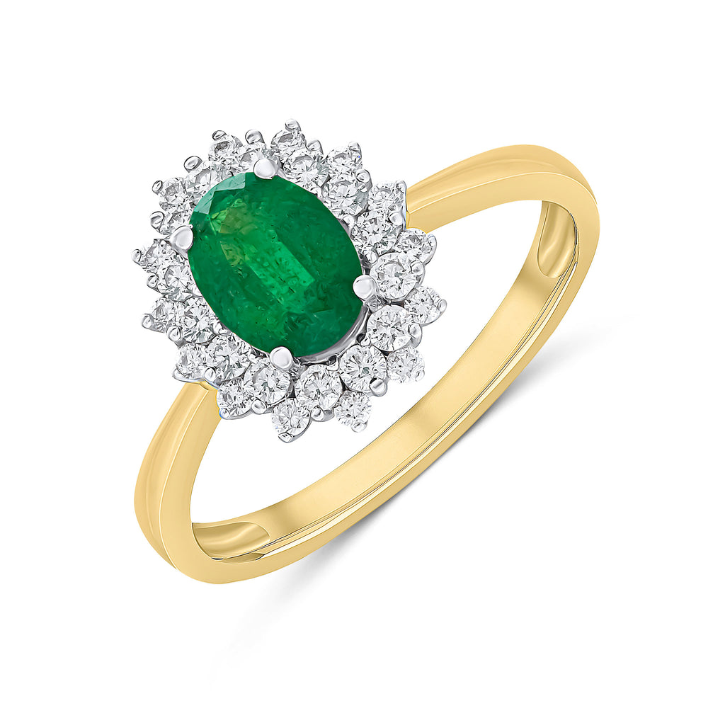 18CT Yellow & White Gold Oval Emerald & Round Diamond Claw Set Cluster Ring 7x5mm