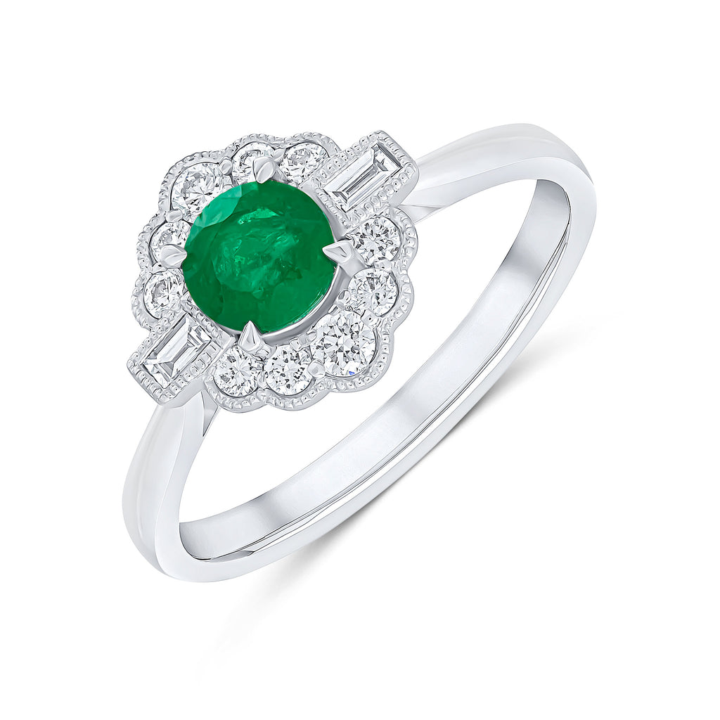18CT White Gold Round Emerald & Baguette & Round Diamond Millegrain Cluster Ring 5mm