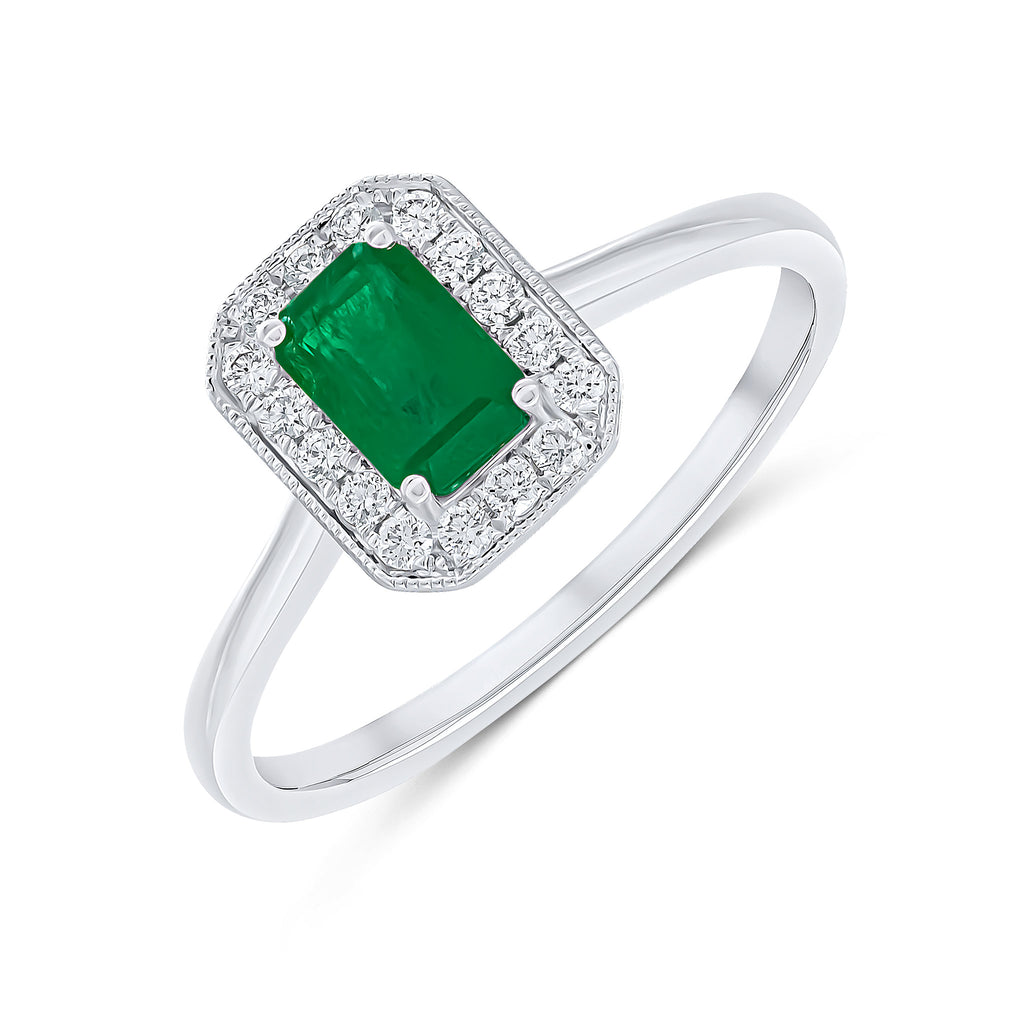 18CT White Gold Claw Set Octagonal Emerald & Millegrain Diamond Cluster Ring 6x4mm