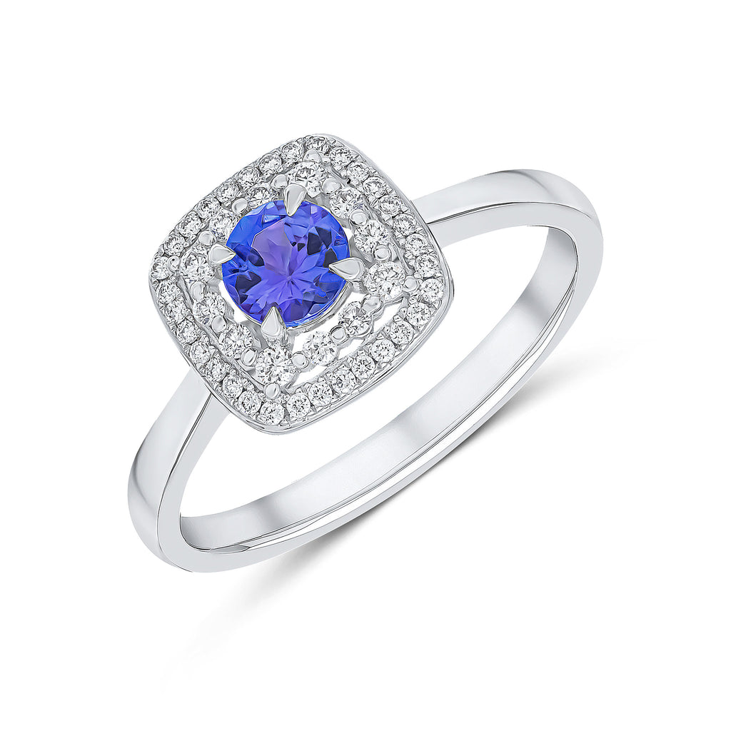 18CT White Gold Round Tanzanite & Diamond 2 Row Border Claw Set Cluster Ring 4.5mm