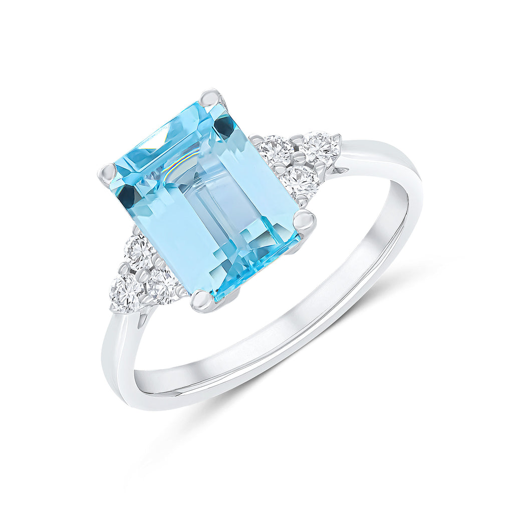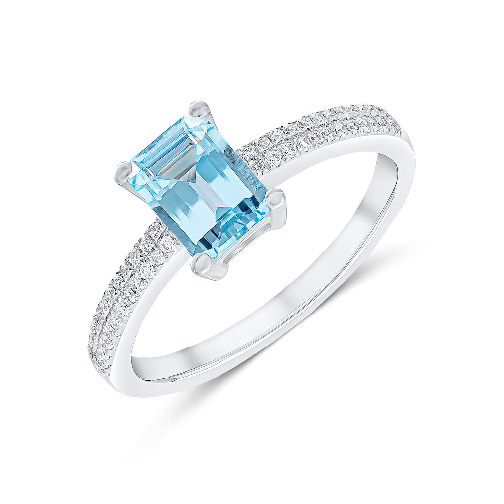 18CT White Gold Claw Set Octagonal Aquamarine Ring with Two Row Pave Set Diamond Shoulders 7x5mm