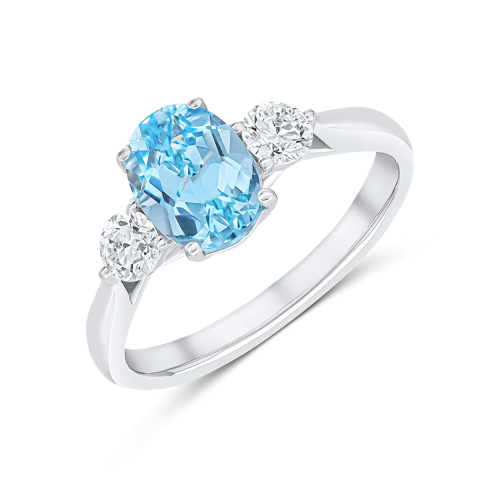 18CT White Gold Oval Aquamarine & Round Diamond Claw Three Stone Ring 8x6mm