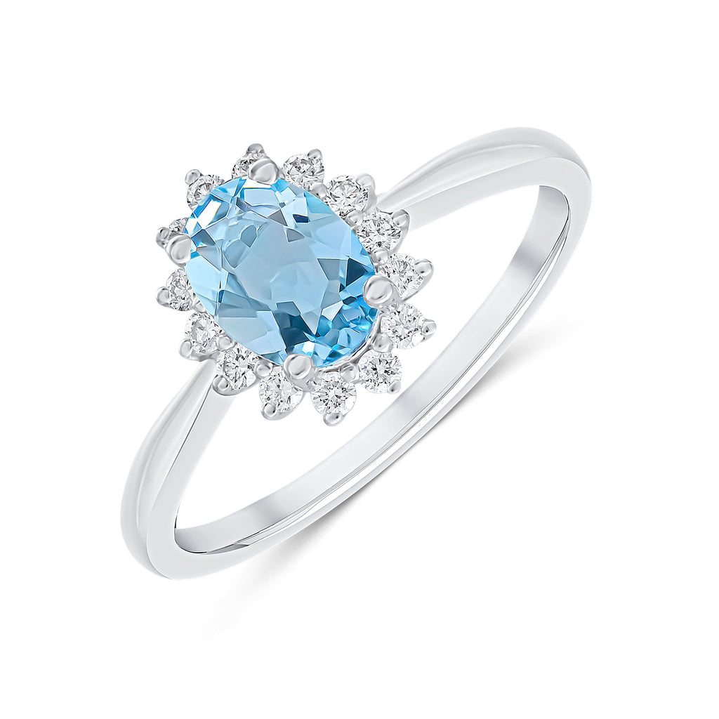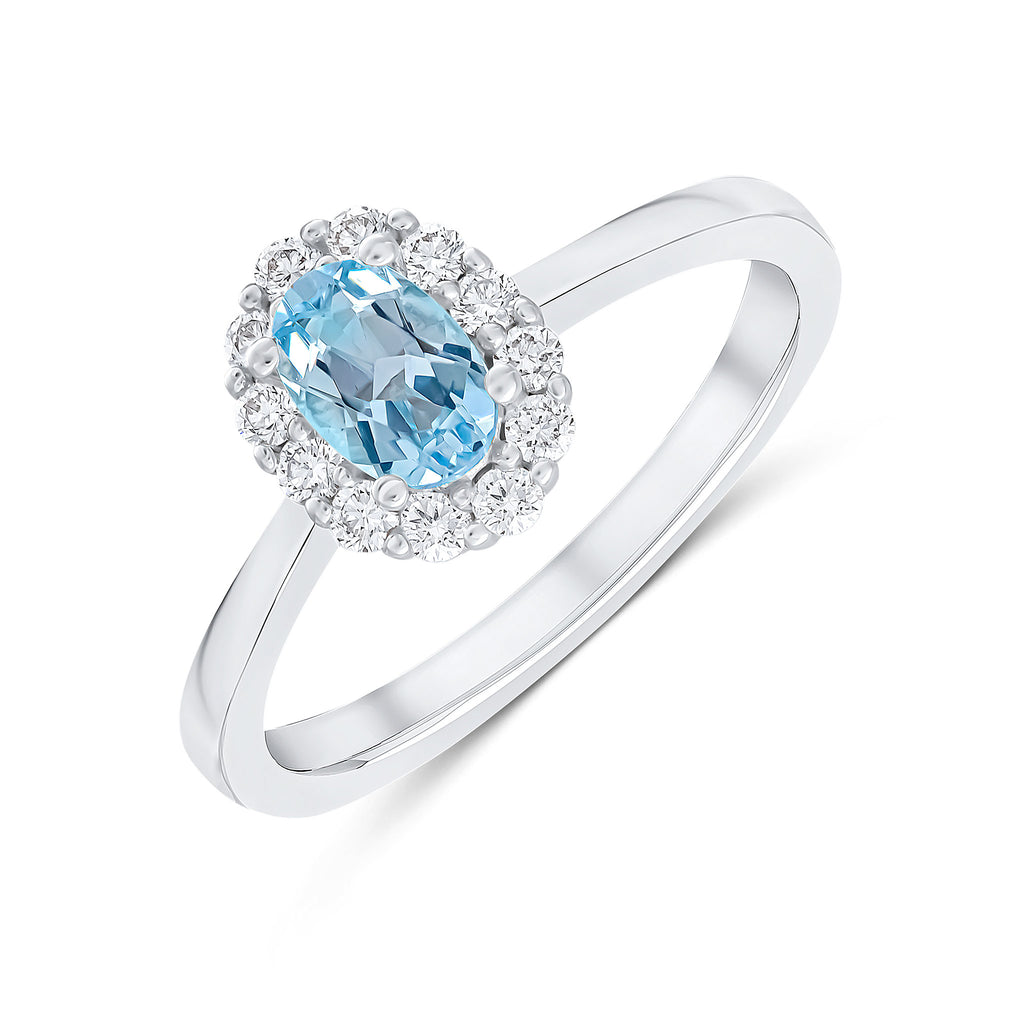 18CT White Gold Oval Aquamarine & Diamond Claw Set Cluster Ring 6x4mm